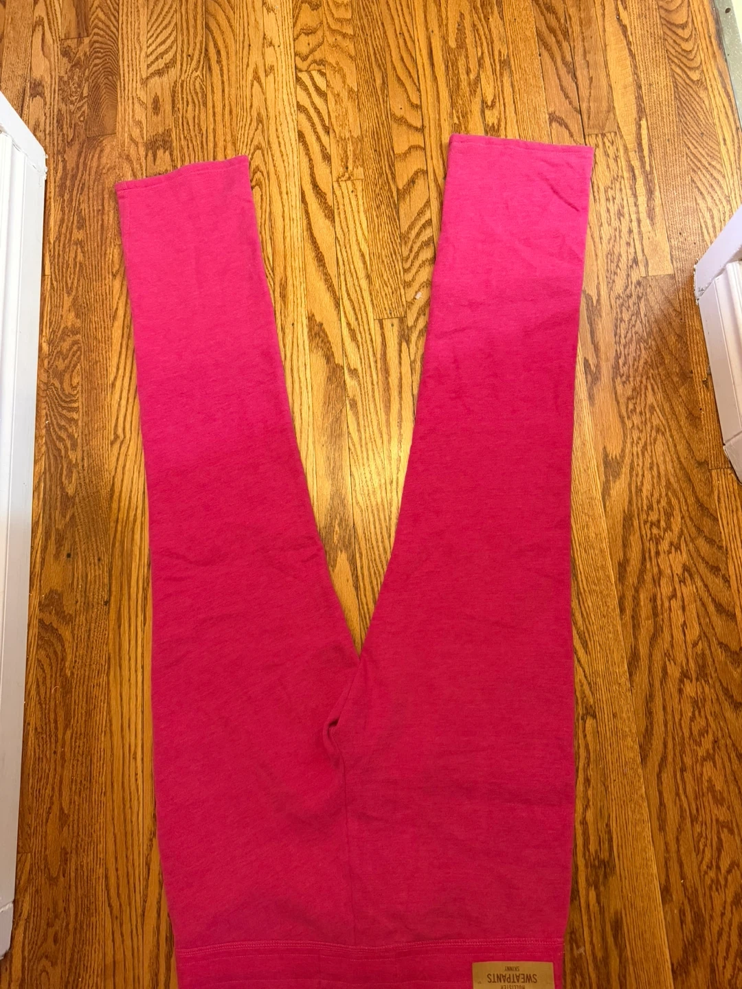 These are bright pink sweatpants from Hollister. They're a size large with a drawstring waist. Features the Hollister logo down the left leg.