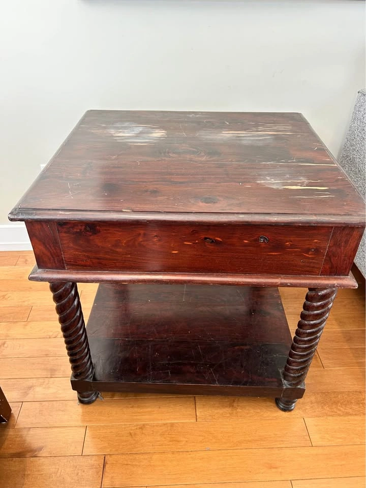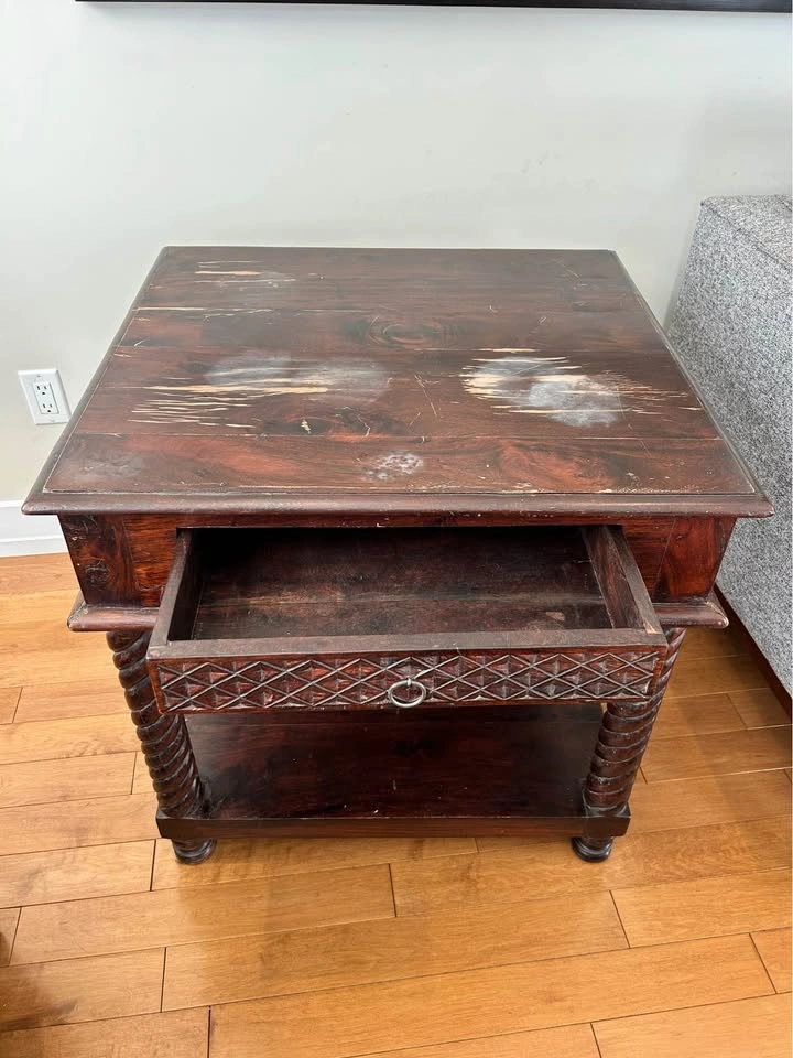 Looking for a piece with actual character? This is a beautiful, solid wood side table that is built to last. No particle board or veneers, it’s heavy and sturdy.