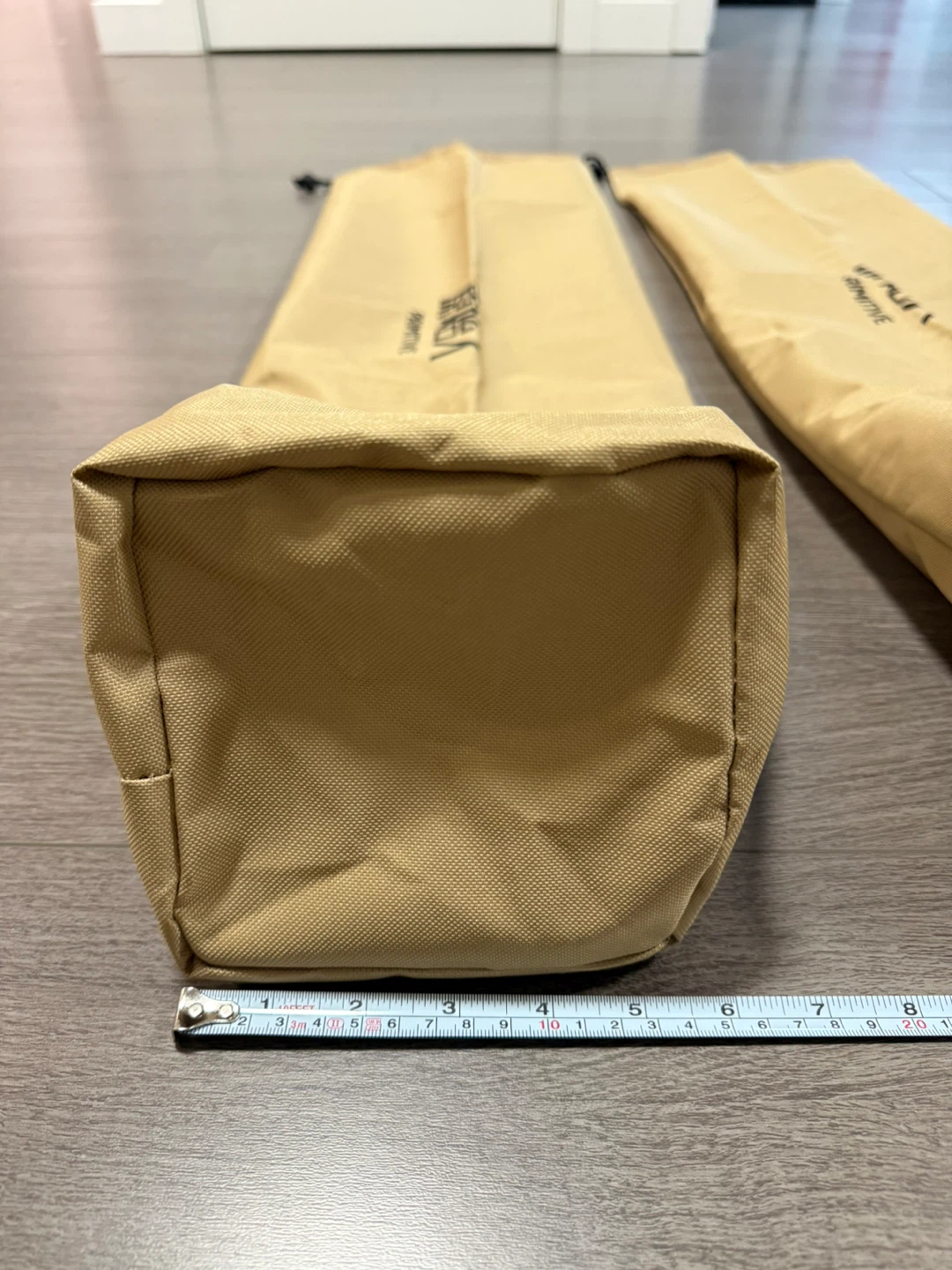 Two tan coloured storage bags for tent poles. They're made of durable fabric and feature drawstring closures. Each bag measures approximately 37 inches long.