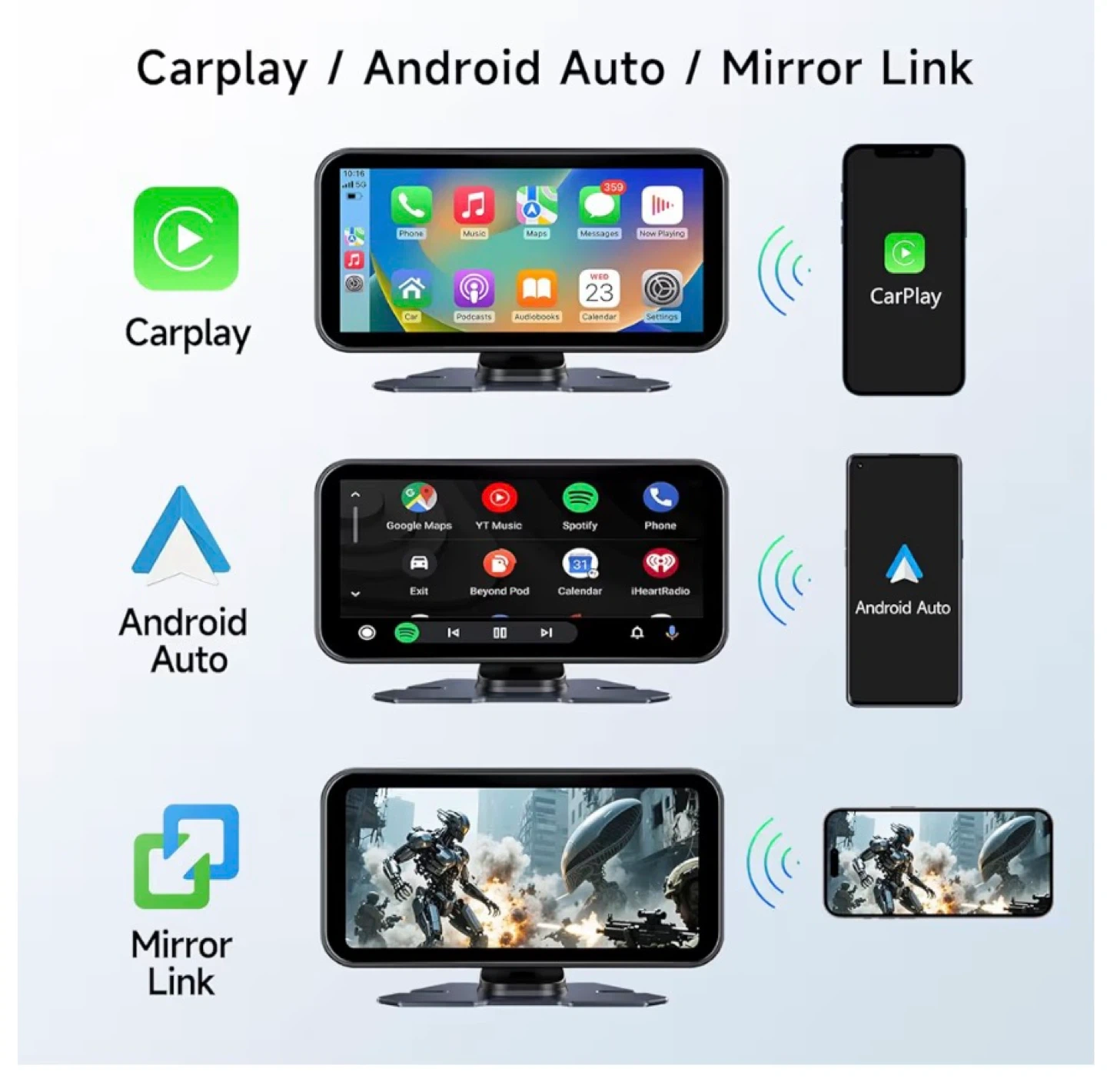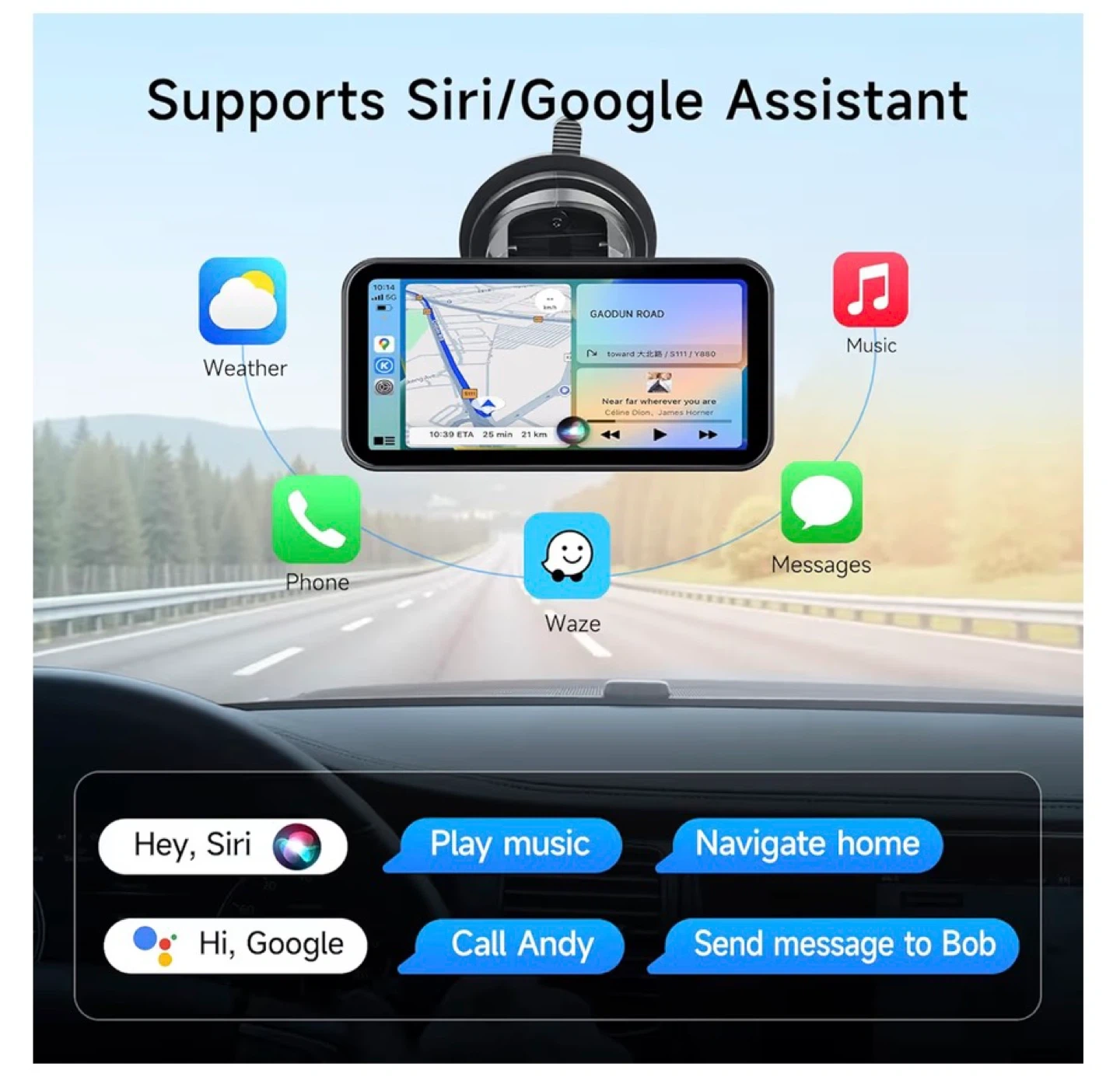 This is a brand new 6-inch portable touchscreen display for your car that supports Wireless CarPlay, Android Auto, and Mirror Link. It also includes Siri/Google Assistant support for hands-free control of music, calls, and messages. Comes with a backup camera and GPS navigation.