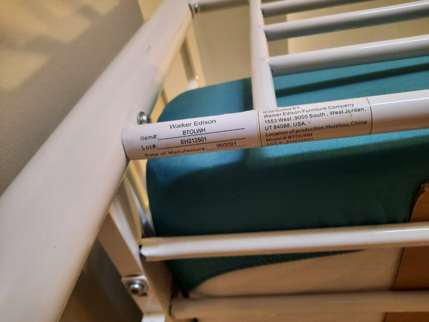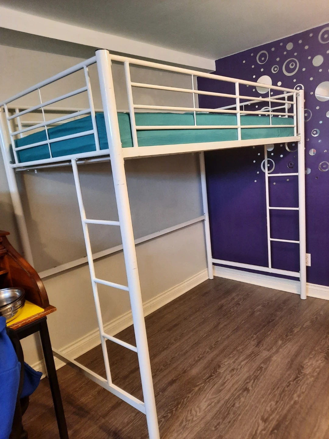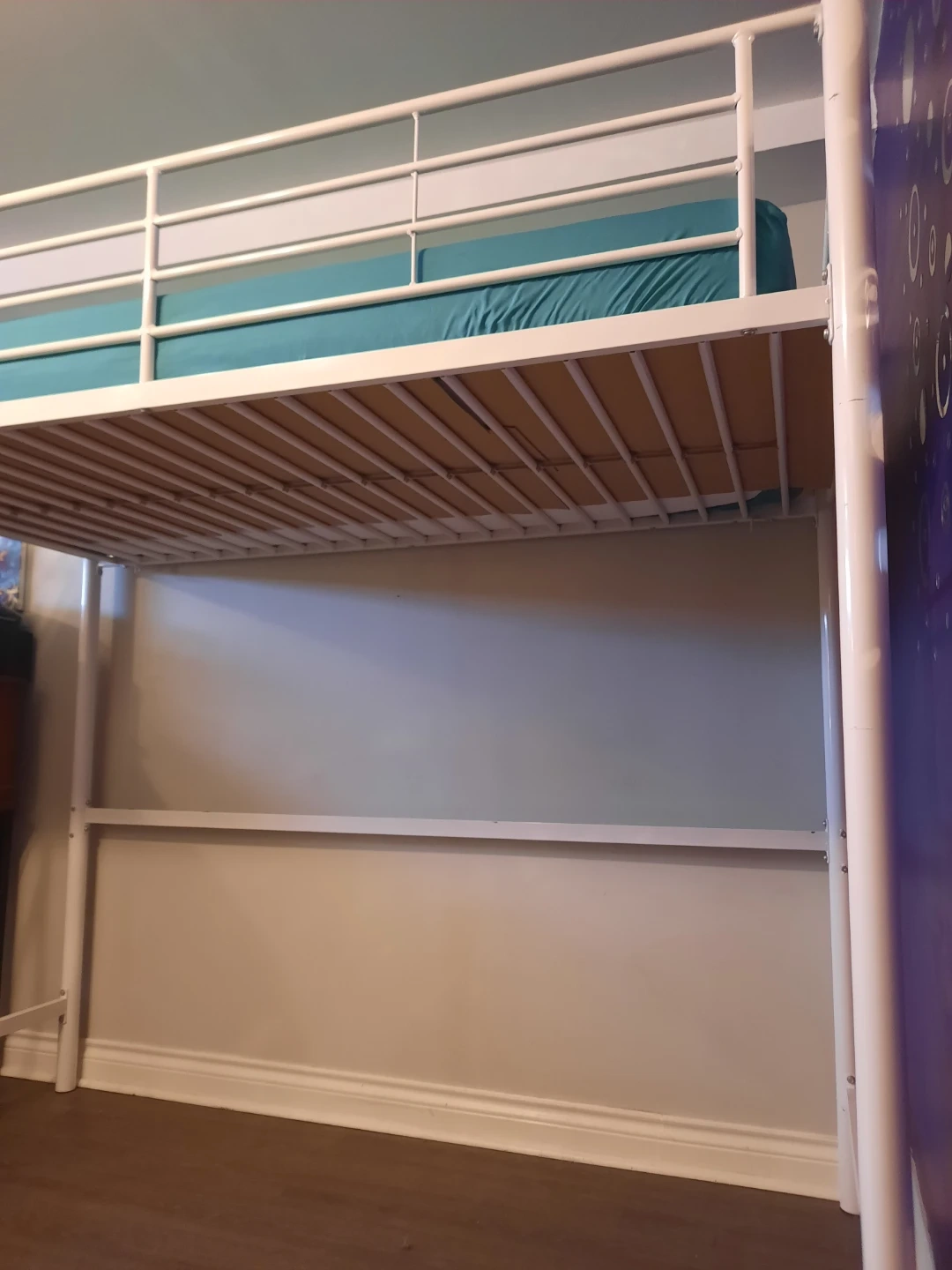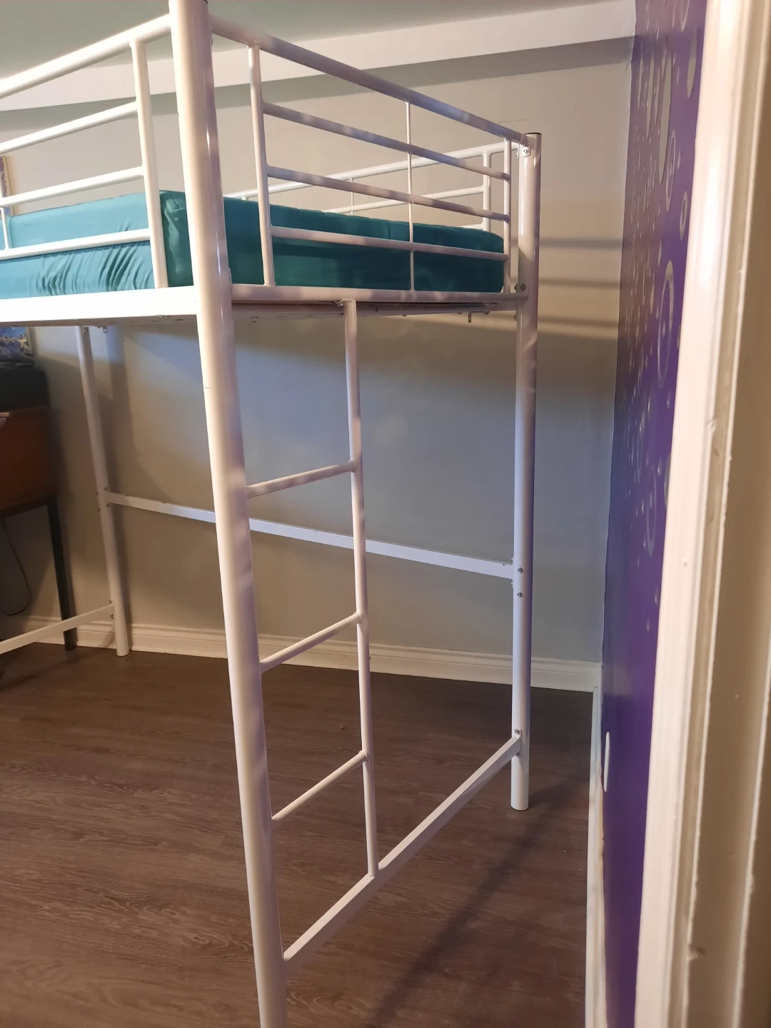 White metal loft bed frame from Walker Edison. Includes safety rails and ladder. Mattress not included. It's perfect for freeing up floor space in smaller rooms. Used for 6 months, bought brand new for $200. Will come disassembled, instructions available online, will share the link.