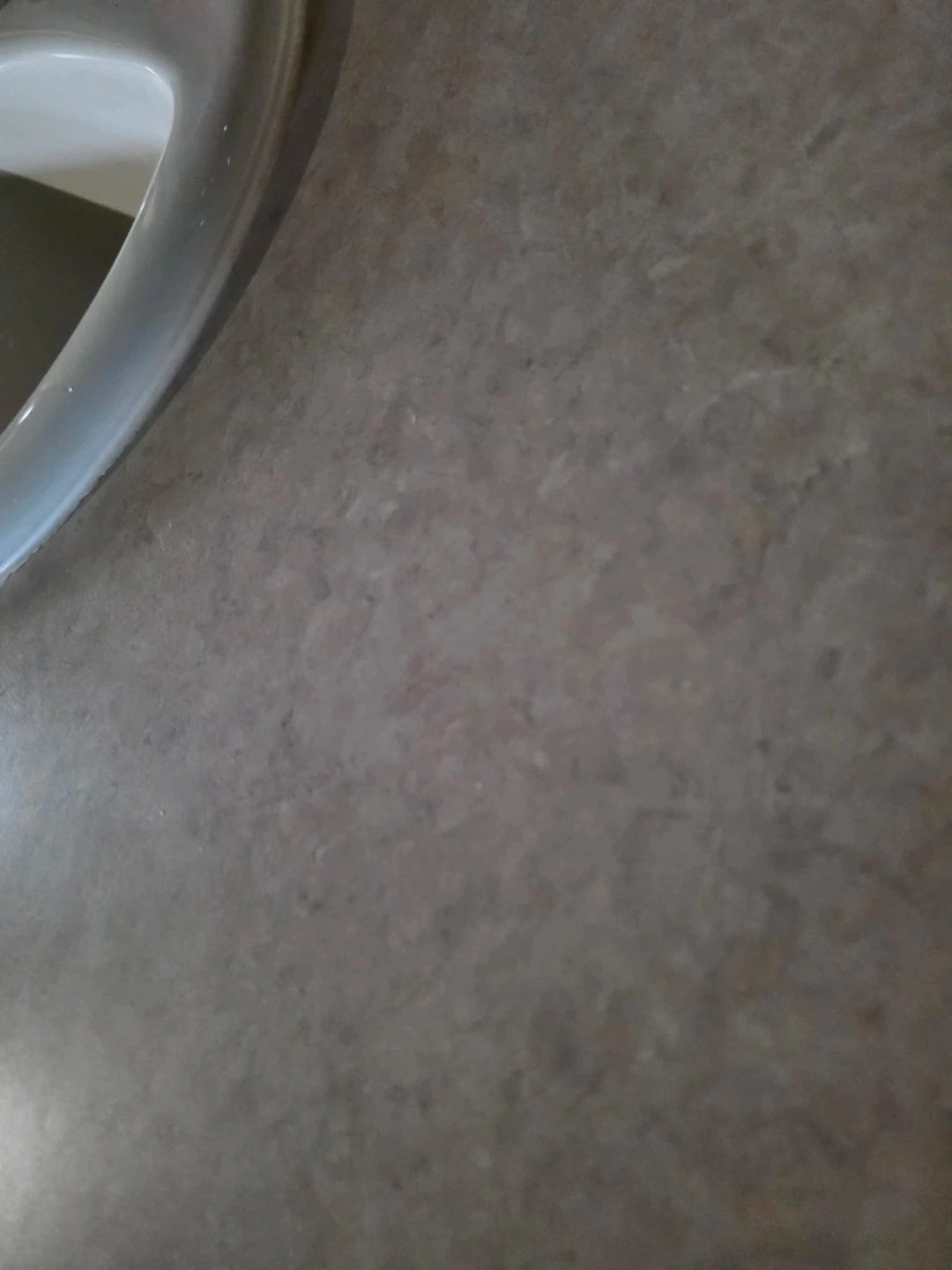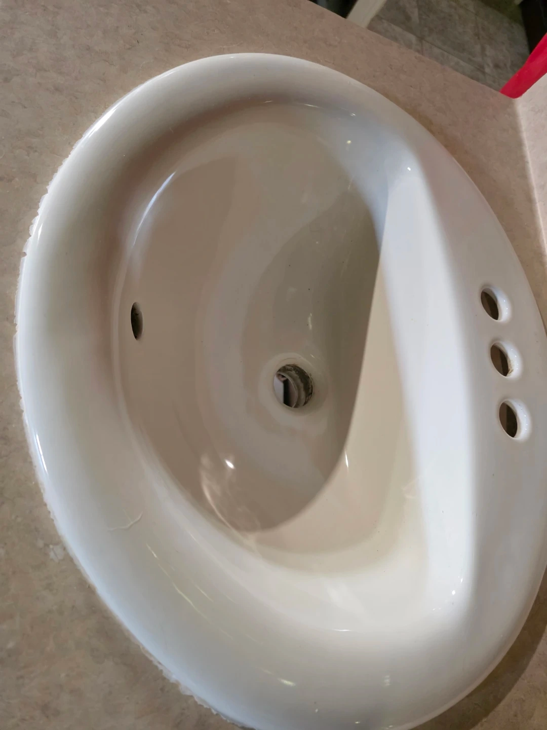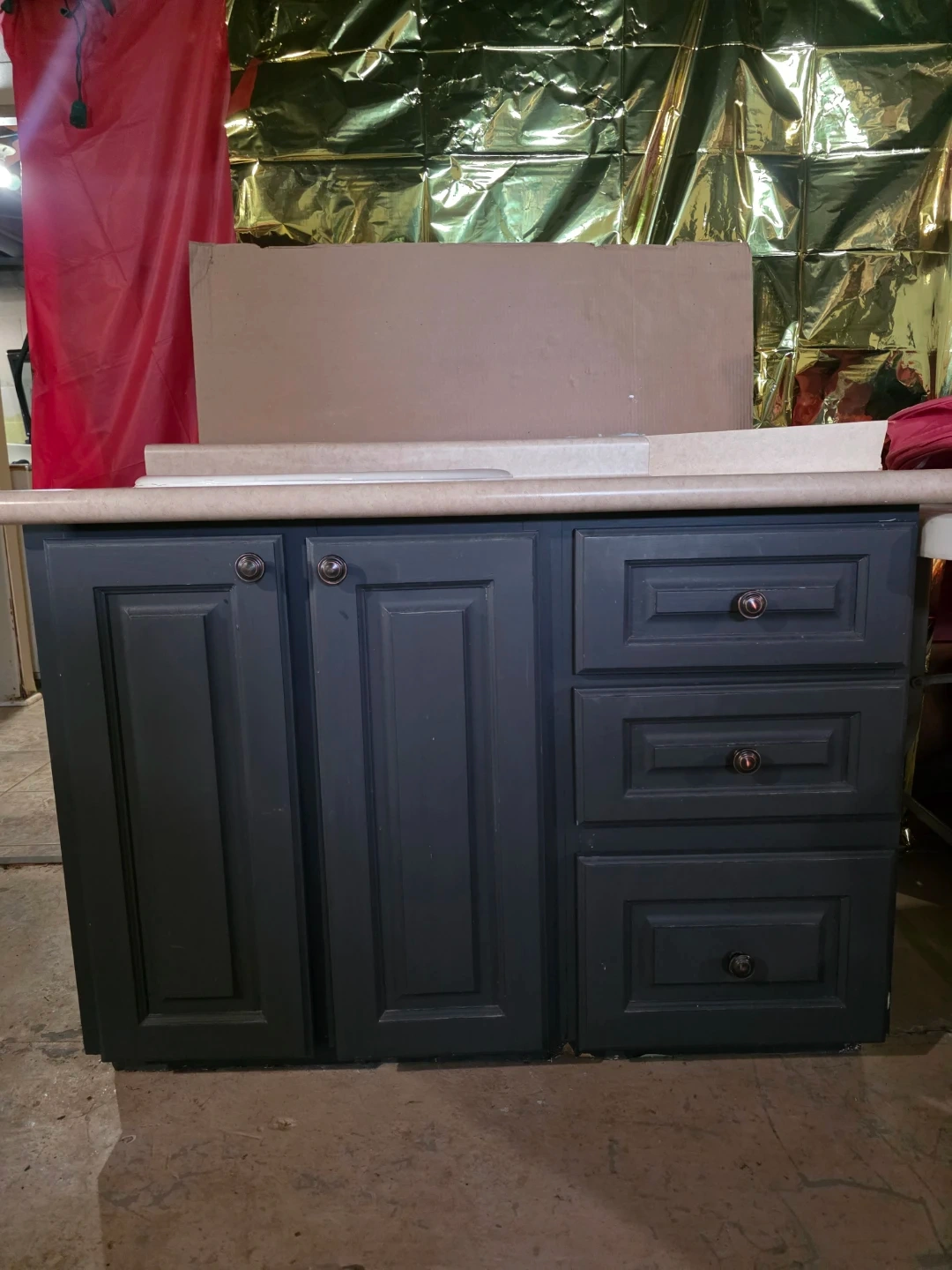 A white porcelain sink is mounted on a speckled countertop. The vanity base is dark grey with three drawers and two cabinet doors. It's a functional set for a bathroom reno. contact for measurements, open to offers!