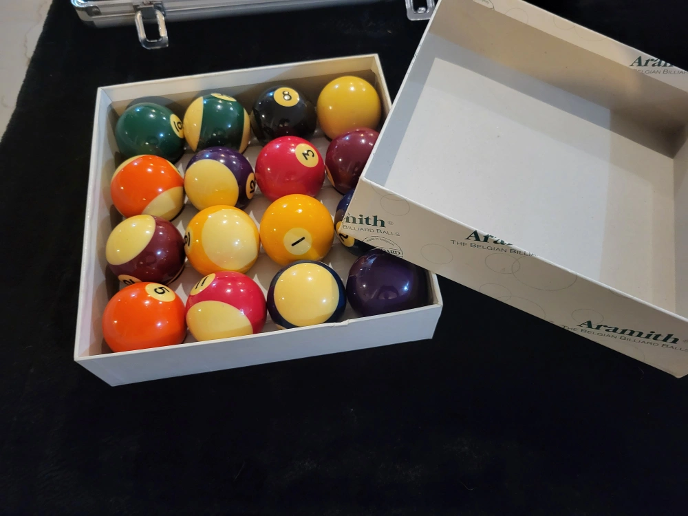 Selling a set of Aramith billiard balls! They come in their original box, perfect for keeping them organized and protected. Each ball is numbered and coloured as you'd expect in a standard set. Ready for your next game of pool!