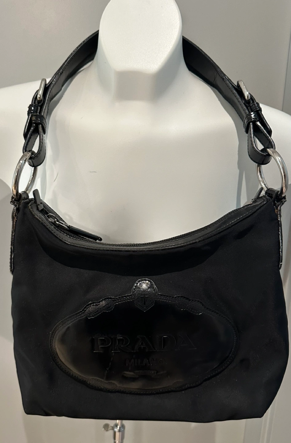 Pre-owned Prada shoulder bag. Black nylon material with leather accents. Features a signature Prada logo plaque. Silver-toned hardware. Single shoulder strap. Minor wear visible.