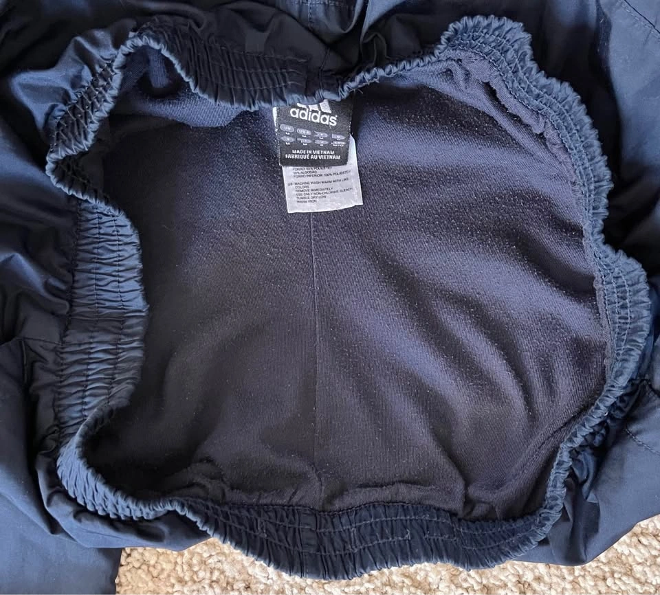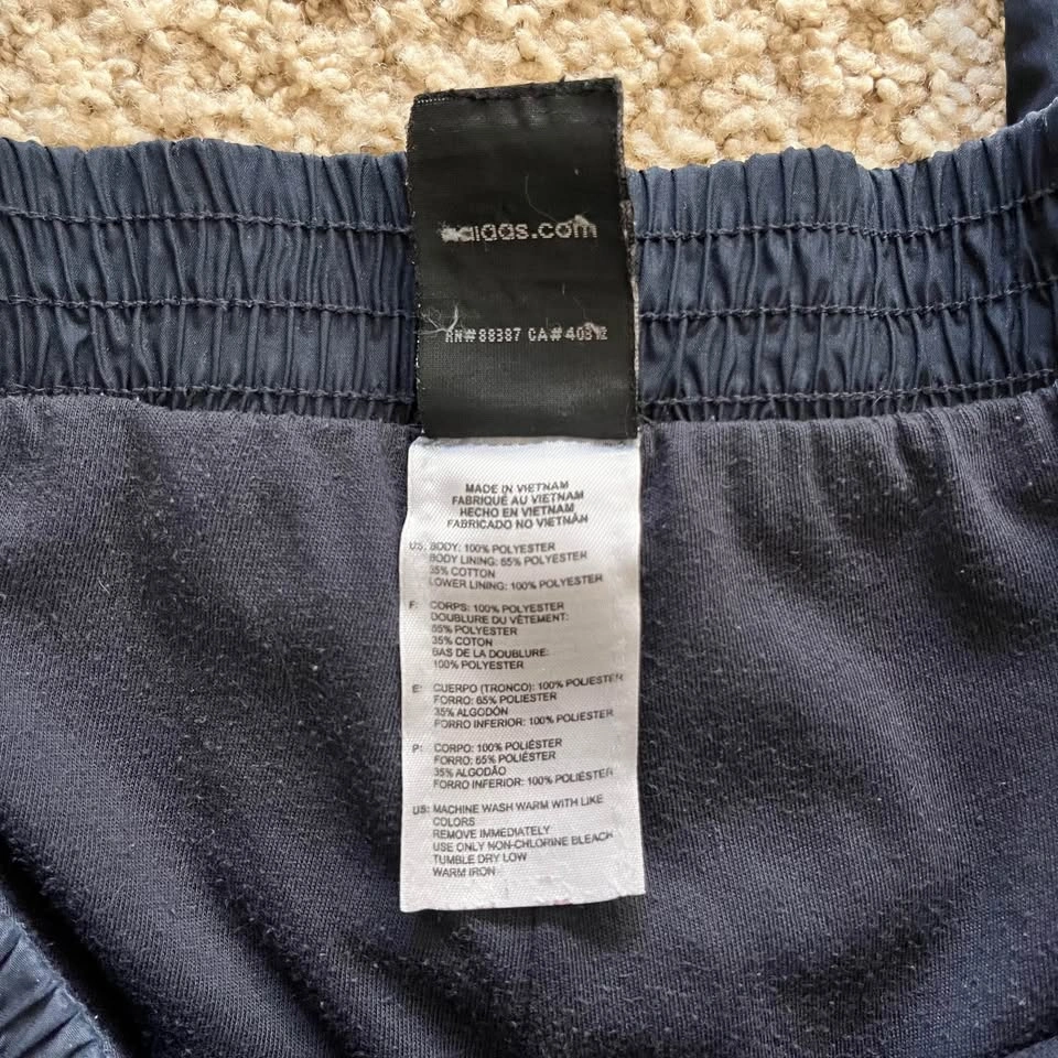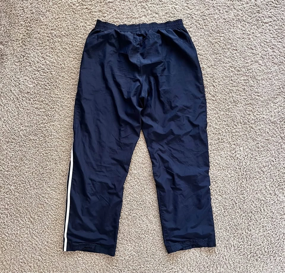 12Adidas pull-on lightweight track pants with an ankle zip down the side of both legs. Solid blue with the iconic Adidas trefoil logo and contrasting white stripes on the bottom legs. They are in fair to good pre-loved condition; the lining has wash wear and some wear to the hems as shown in the photos. Men's Size Medium Body: 100% Polyester Lining: 65% Polyester, 35% Cotton Measurements are approx.: Length 101cm Waist 38cm Rise 29cm Inseam 76cm Cuff 22cm Porch pick up west Maple Ridge.