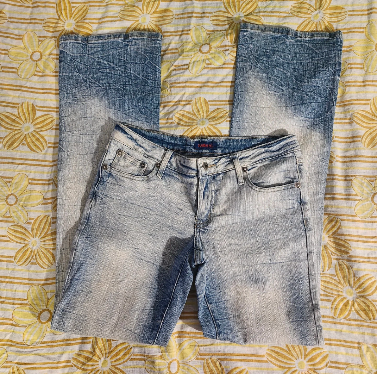 75super cool straight leg late 90s early 2000s faded jeans by the brand Zana Di Jeans. Has a really unique faded look label size 5, waist laying flat measures just under 16in, length is 40.5in item is in good used vintage condition with no flaws or stains that I could notice