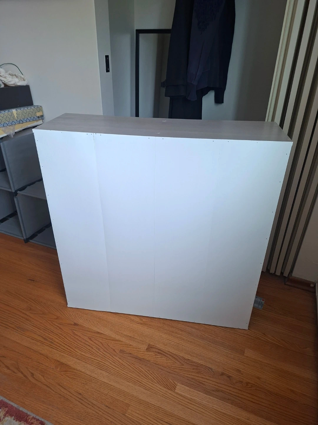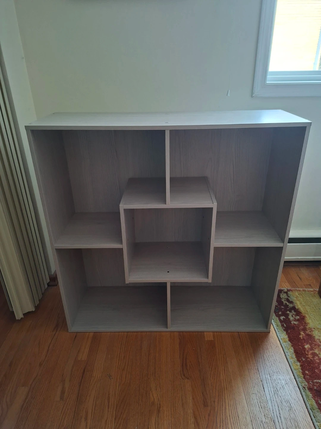 This shelf unit features a modern stylish wood-grain finish and a unique cube in the centre. It's great for storing books or displaying decor! The approximate dimensions are 35.5" length x 11.5" deep/width x 35.5" high.