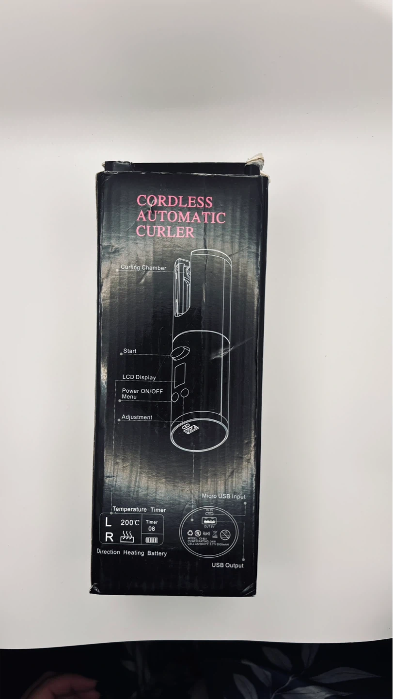 This cordless automatic hair curler features a ceramic coated curl chamber with a 19mm diameter. It offers a temperature regulator from 150-200°C and a time regulator for styling between 8-18 seconds. It also has an audible indication system and a USB charger with a power bank function.