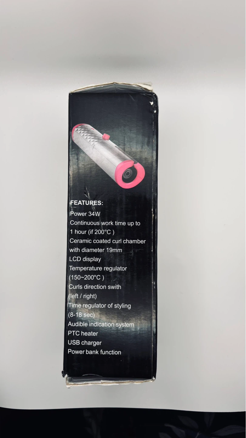 This cordless automatic hair curler features a ceramic coated curl chamber with a 19mm diameter. It offers a temperature regulator from 150-200°C and a time regulator for styling between 8-18 seconds. It also has an audible indication system and a USB charger with a power bank function.
