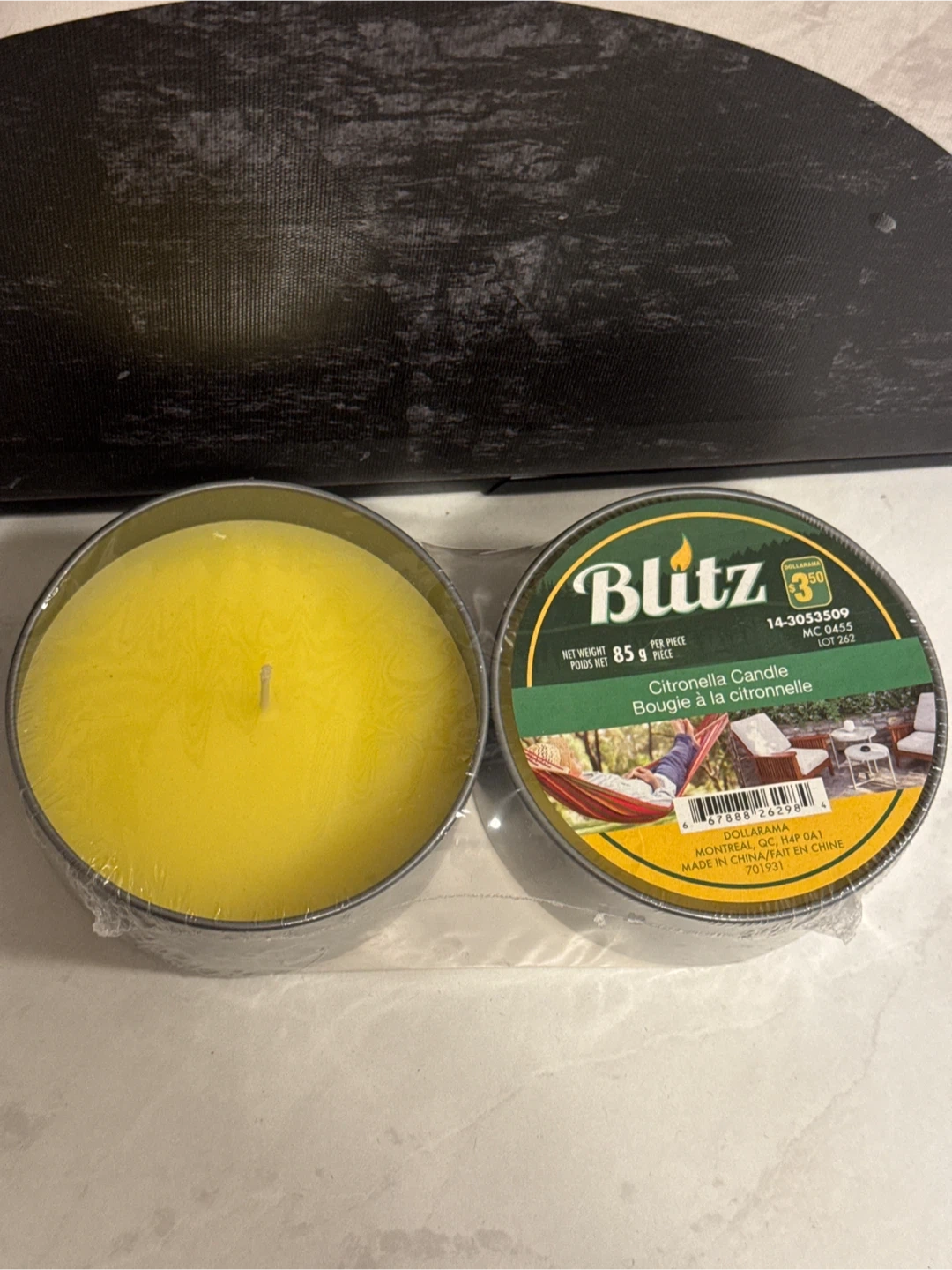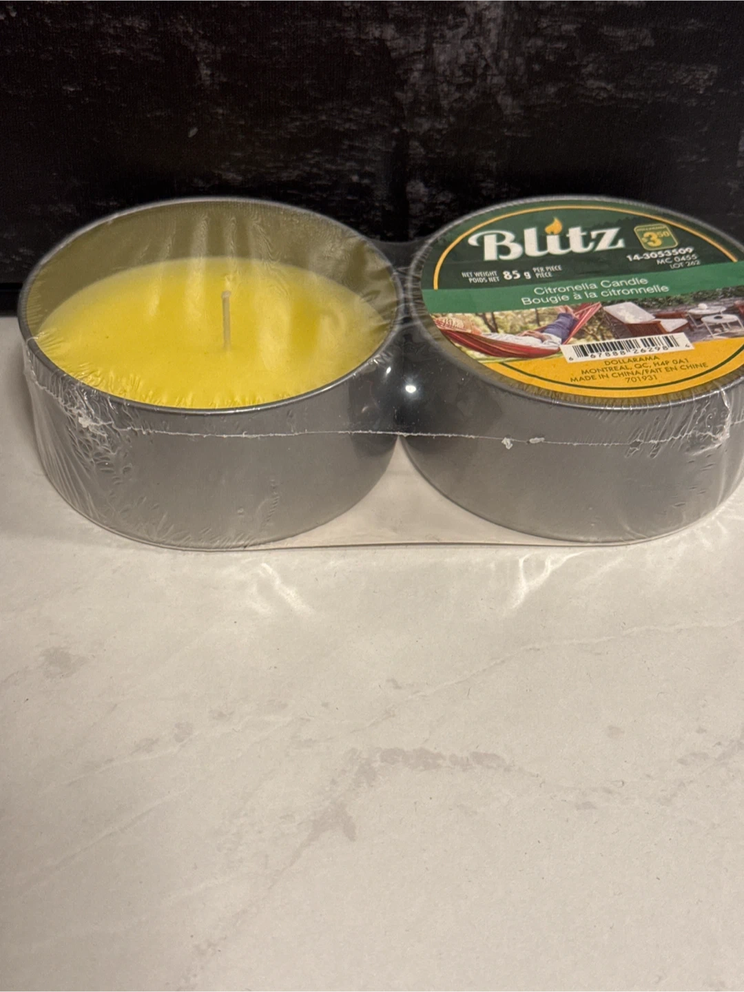 Two Blitz Citronella candles in metal tins. Net weight 85 g per piece. They're great for keeping bugs away outdoors! Made in China.
