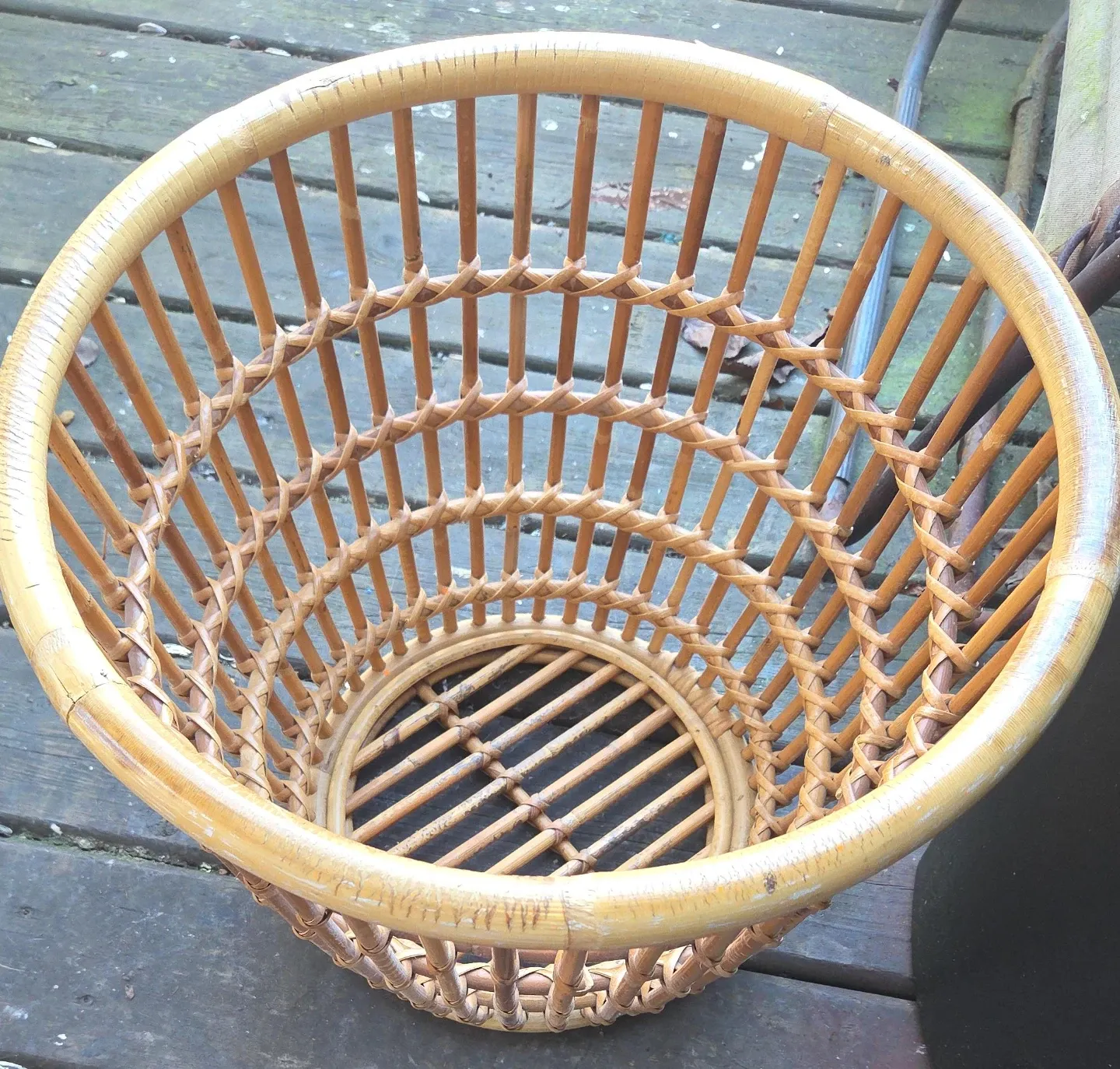 A nice rattan wicker basket with a circular base and open weave. It's perfect for storage or as a decorative accent piece. The material is natural rattan.