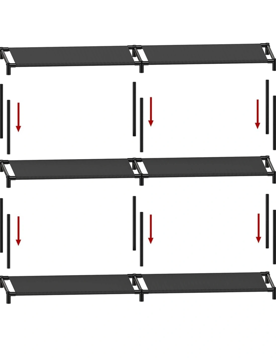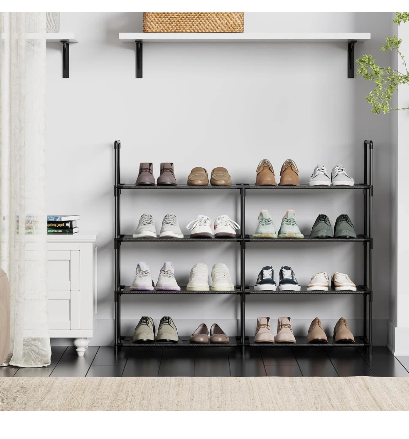 This black shoe rack organizer has 4 tiers for ample storage. It measures 33" wide, 27.8" tall, and 11" deep. Each shelf has 6.3" of vertical clearance, and you can remove a layer to fit boots or high heels.