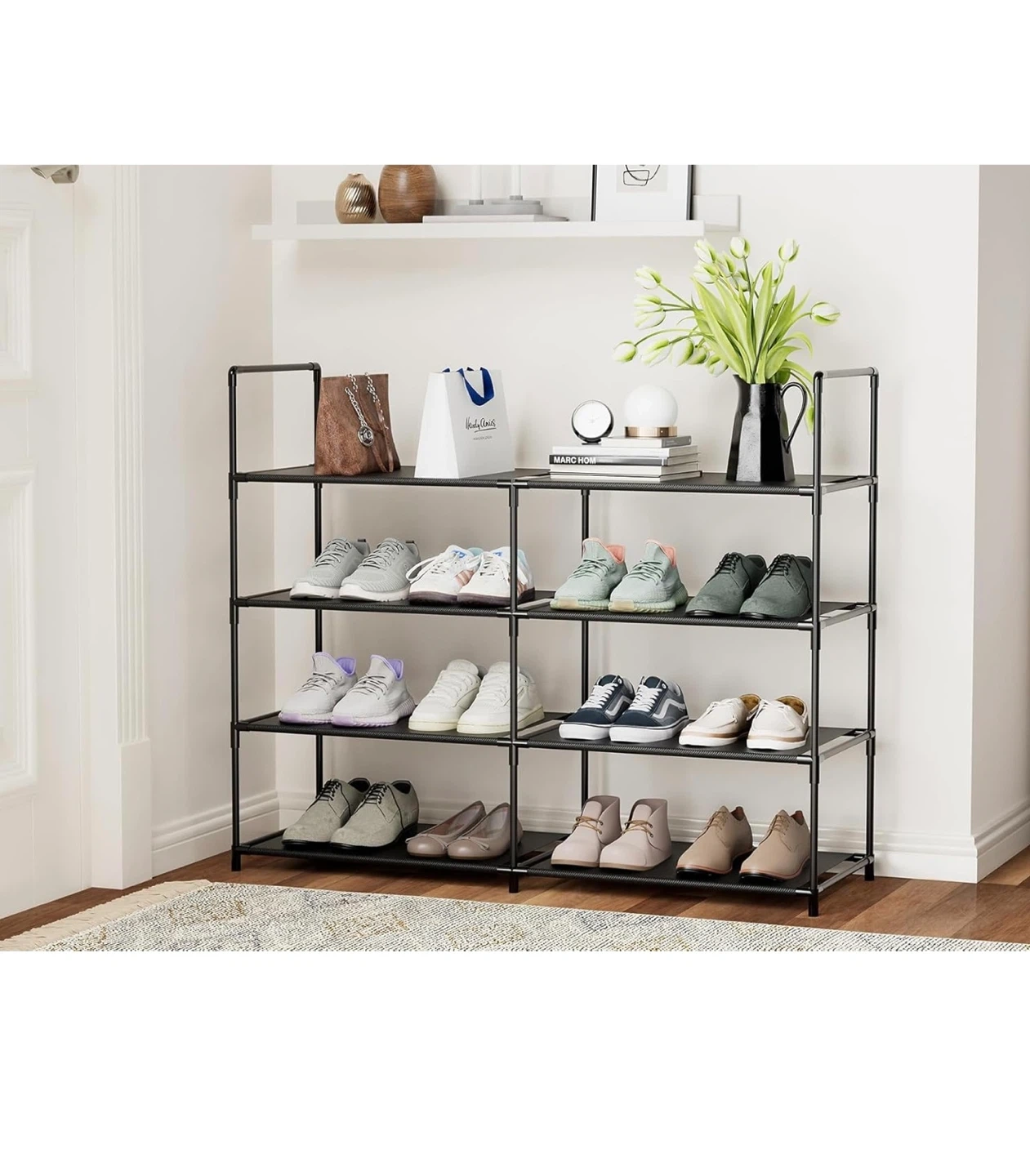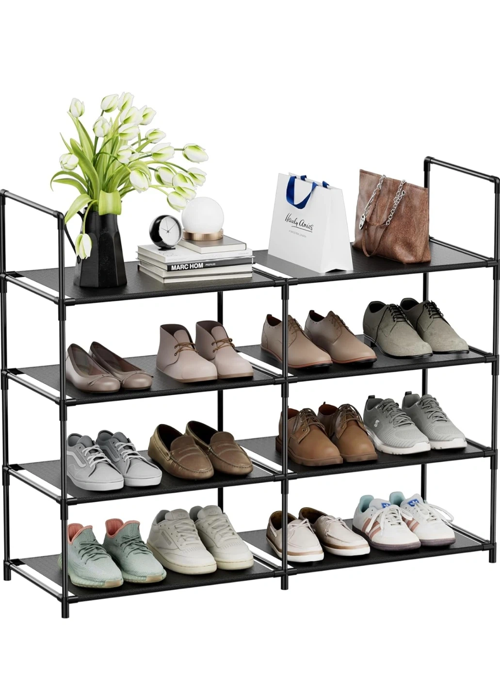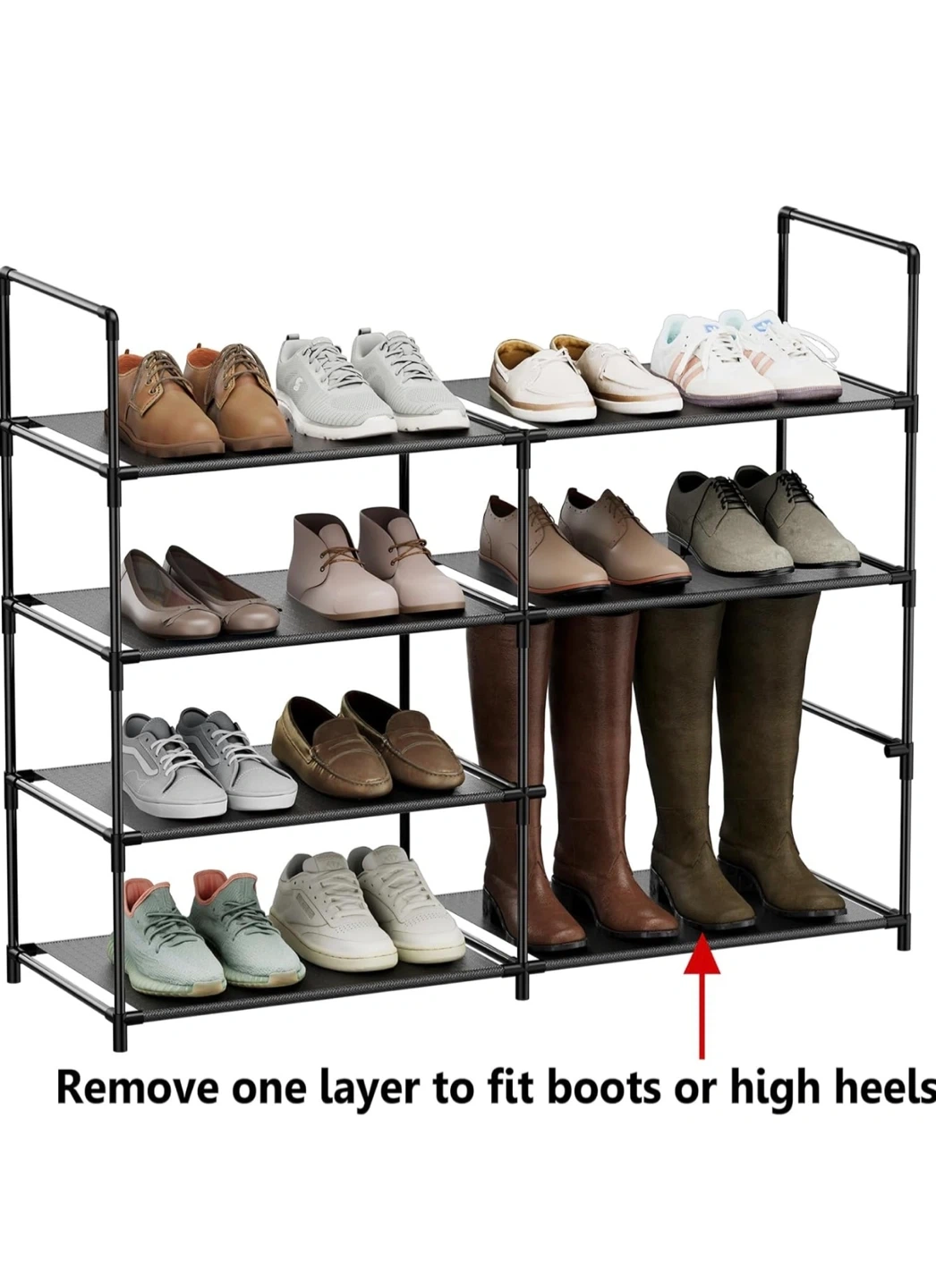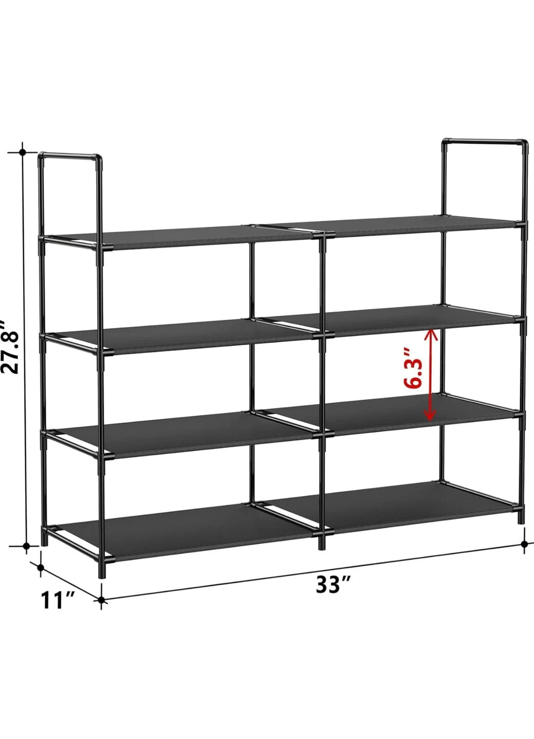 This black shoe rack organizer has 4 tiers for ample storage. It measures 33" wide, 27.8" tall, and 11" deep. Each shelf has 6.3" of vertical clearance, and you can remove a layer to fit boots or high heels.