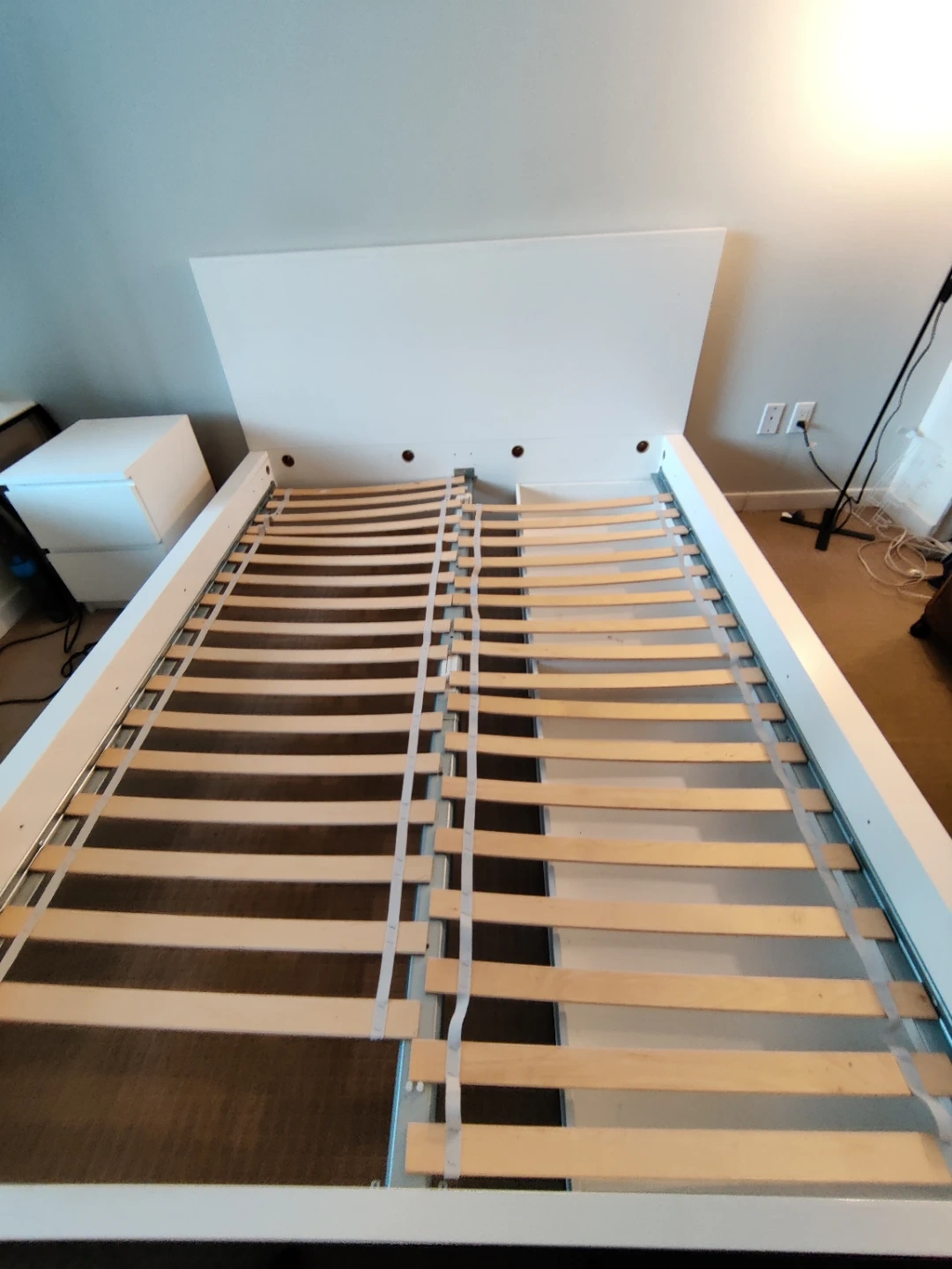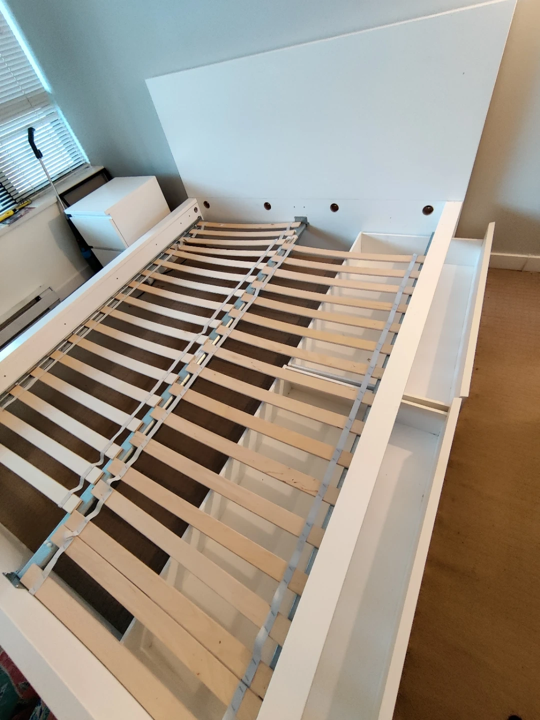 This is a white queen-size bed frame with a headboard and integrated storage drawers. It includes a slatted base for mattress support. The frame is made of wood composite and features a modern design.
