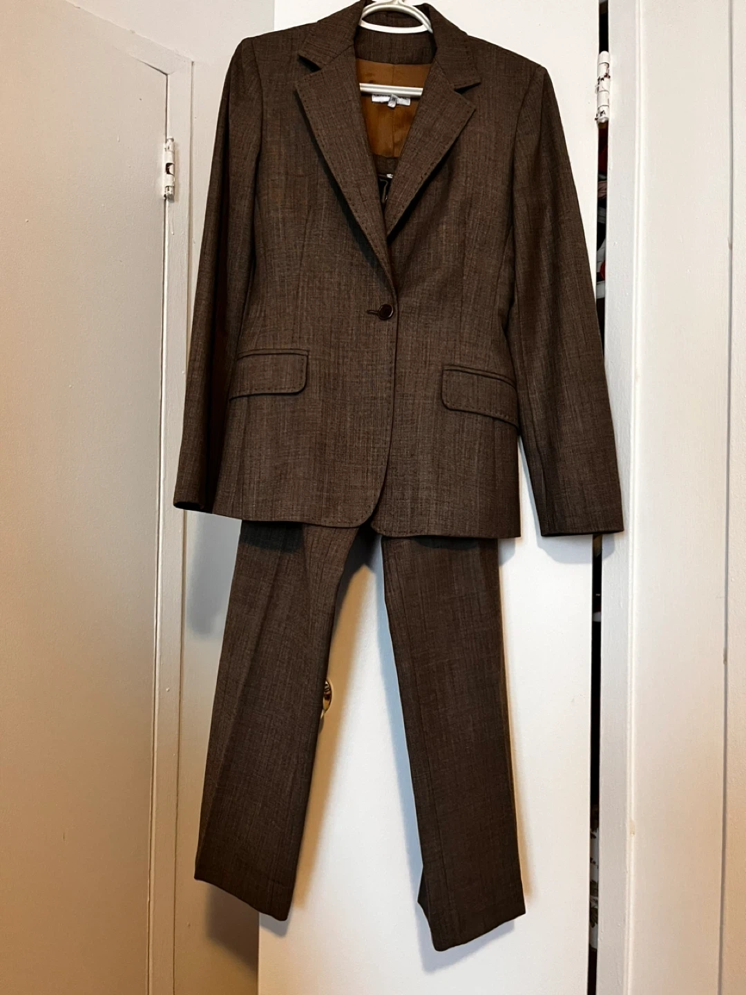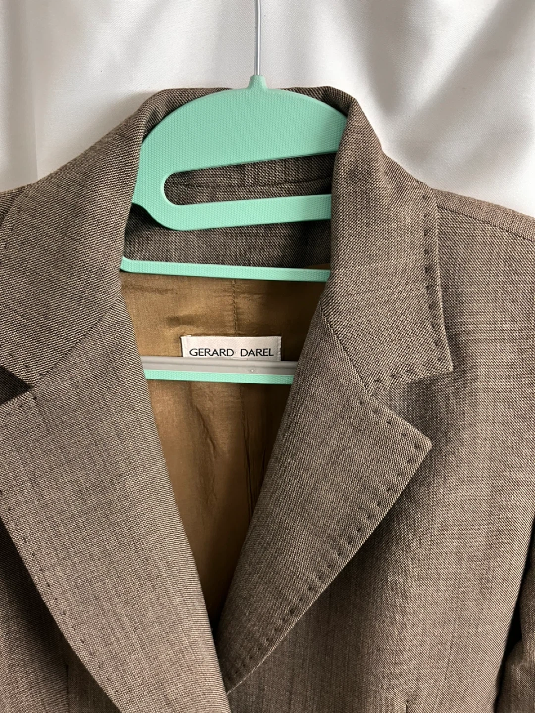 This is a Gérard Darel brown blazer and matching pants set. The suit is made from a textured fabric. It's a stylish choice for professional or casual wear! Size 36, pants are high rise, jacket has lining with button closure.