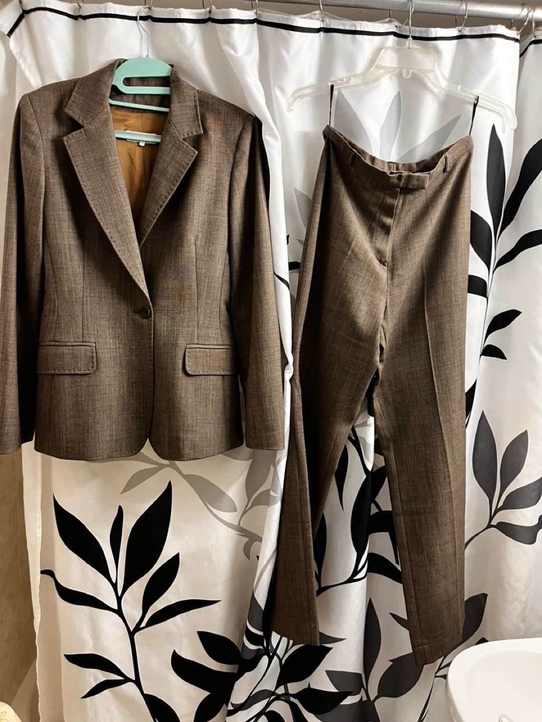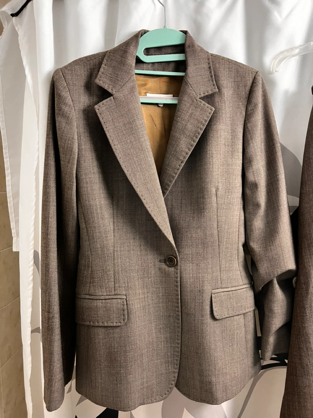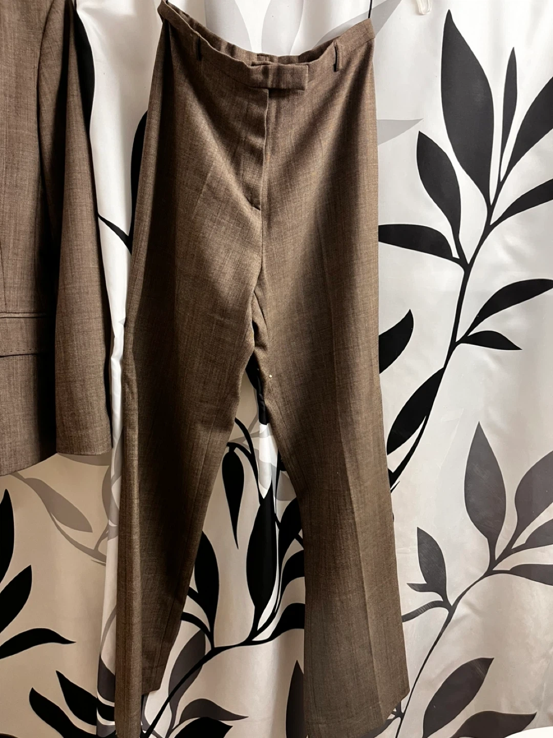 This is a Gérard Darel brown blazer and matching pants set. The suit is made from a textured fabric. It's a stylish choice for professional or casual wear! Size 36, pants are high rise, jacket has lining with button closure.