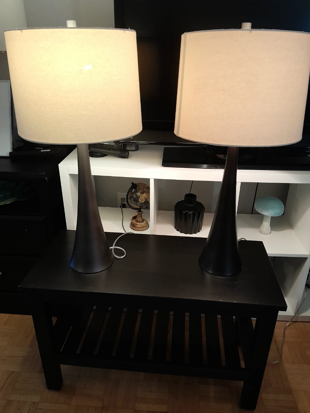 Vintage lampshades with some signs of wear. Both have lights working but one lamp switch is loose. It will light up as you plug in.