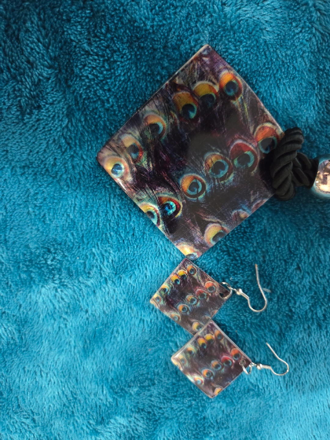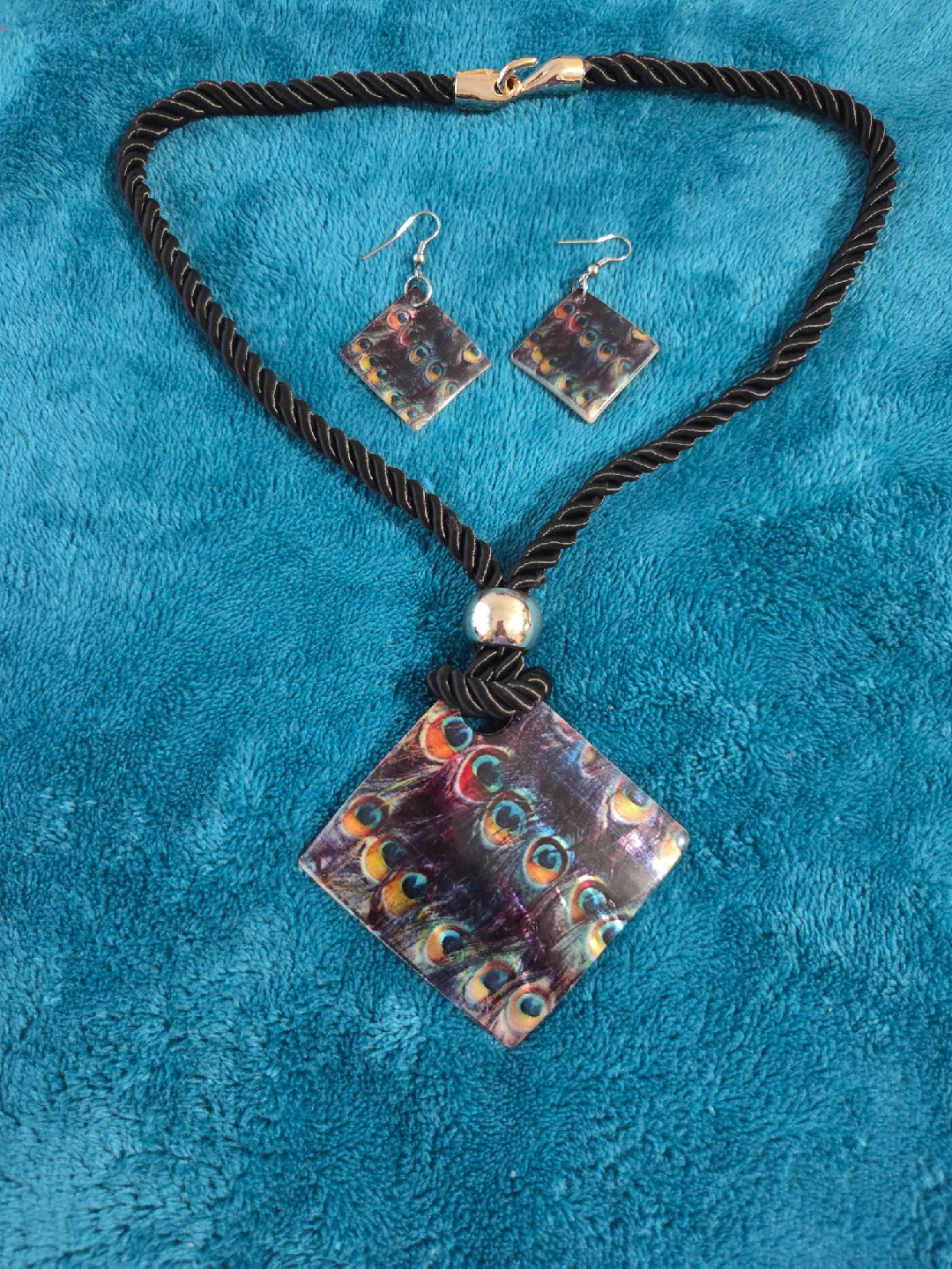 Selling a beautiful necklace and earring set. The set features a unique peacock feather design on square pendants. The necklace has a black cord and silver-tone accents. The earrings are matching. Perfect for adding a pop of colour to any outfit