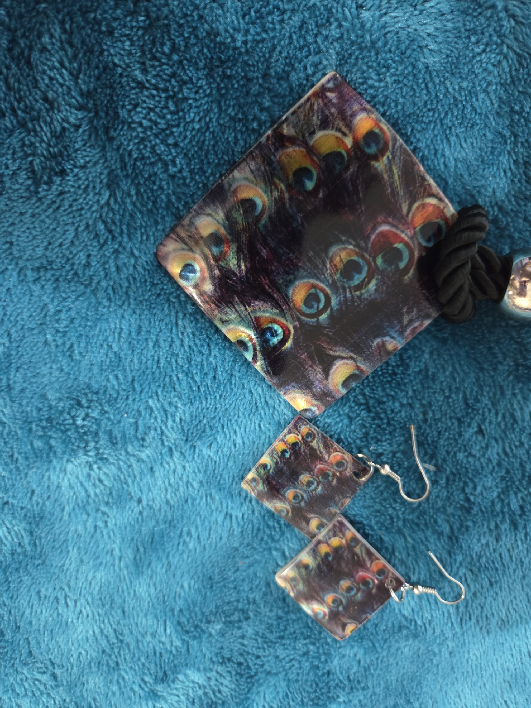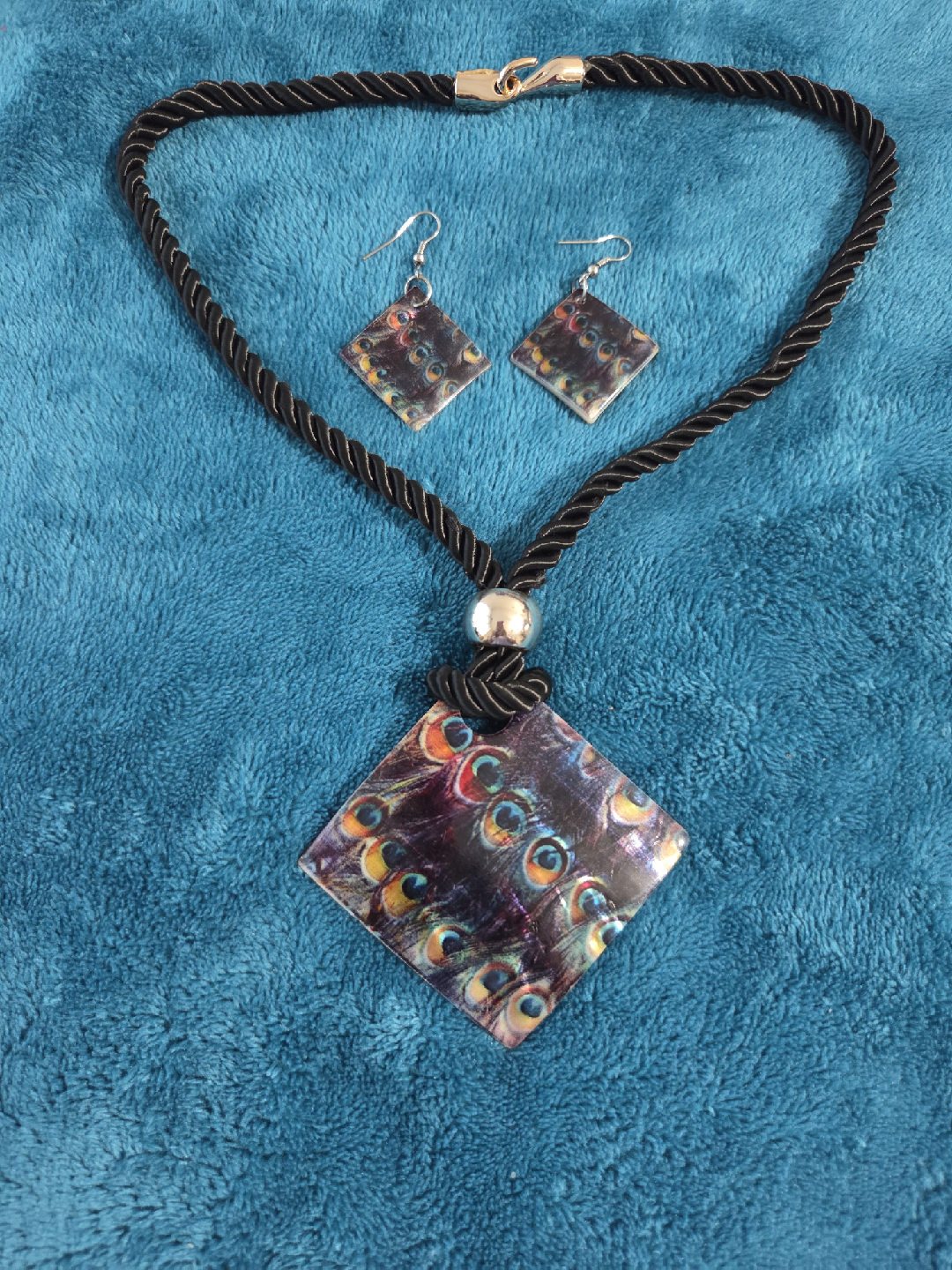 Selling a beautiful necklace and earring set. The set features a unique peacock feather design on square pendants. The necklace has a black cord and silver-tone accents. The earrings are matching. Perfect for adding a pop of colour to any outfit
