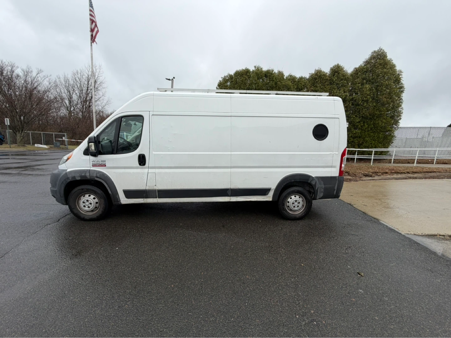 This is a white Ram ProMaster cargo van. It has a sliding side door and rear barn doors. The exterior shows some signs of wear. The vehicle has no problems; it is in perfect condition and has four new tires. El vehículo no tiene ningún problema está en perfecto estado y tiene cuatro gomas nuevas number 9179417504