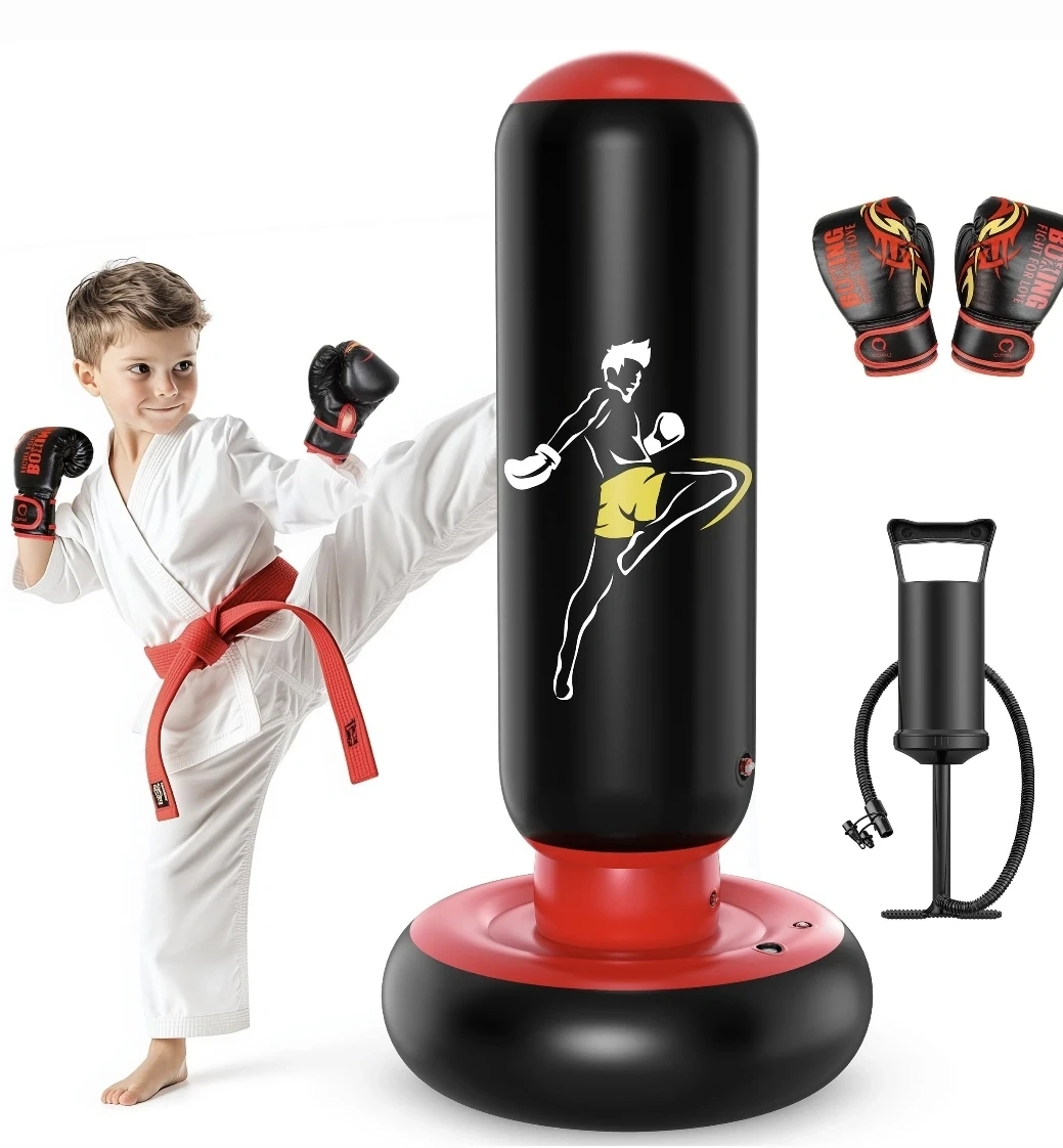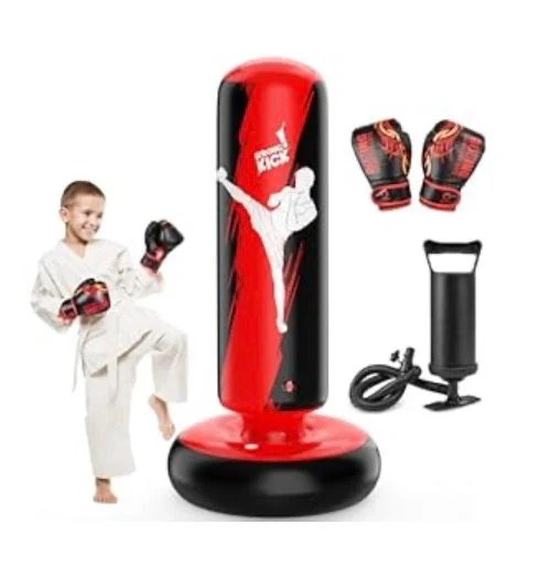 This inflatable punching bag is made of durable material and includes a pair of boxing gloves and an air pump. It's designed for kids to practice their kicks and punches. The base can be filled with water or sand for stability.