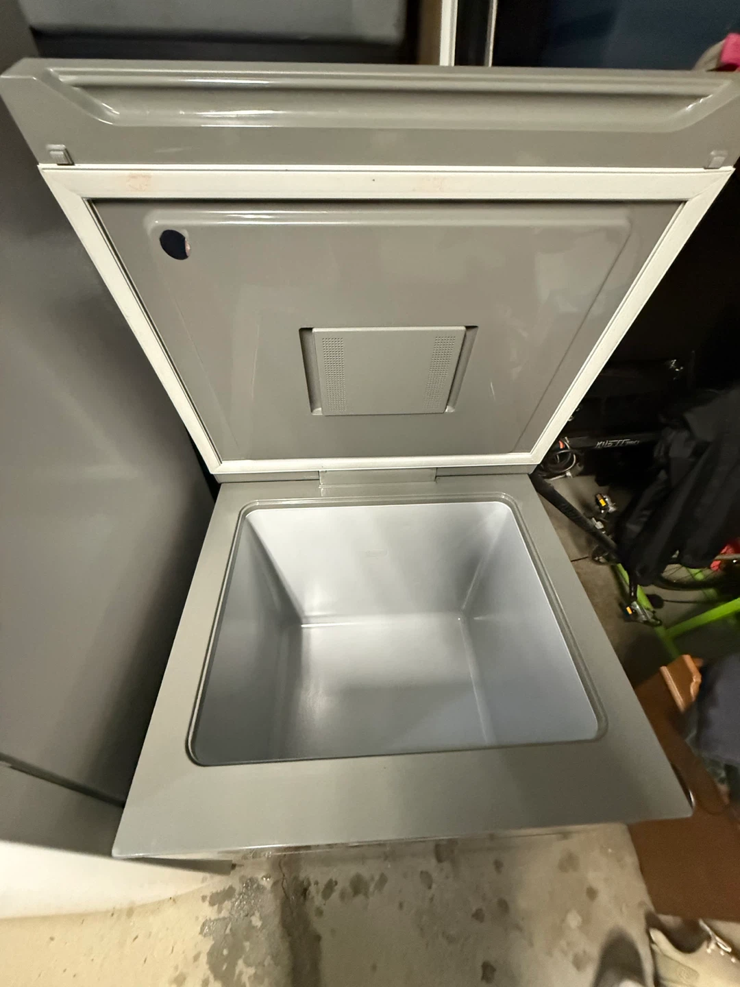 This is an LG Smart Inverter chest freezer. It's a chest-style freezer with a gray exterior. It's a convenient size for storing extra food. It features a Smart Inverter compressor.