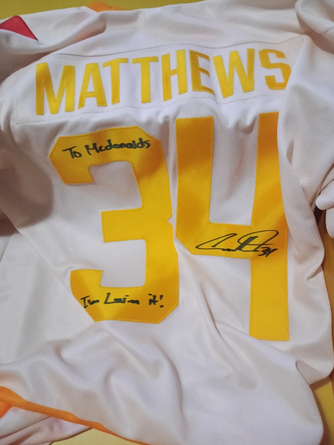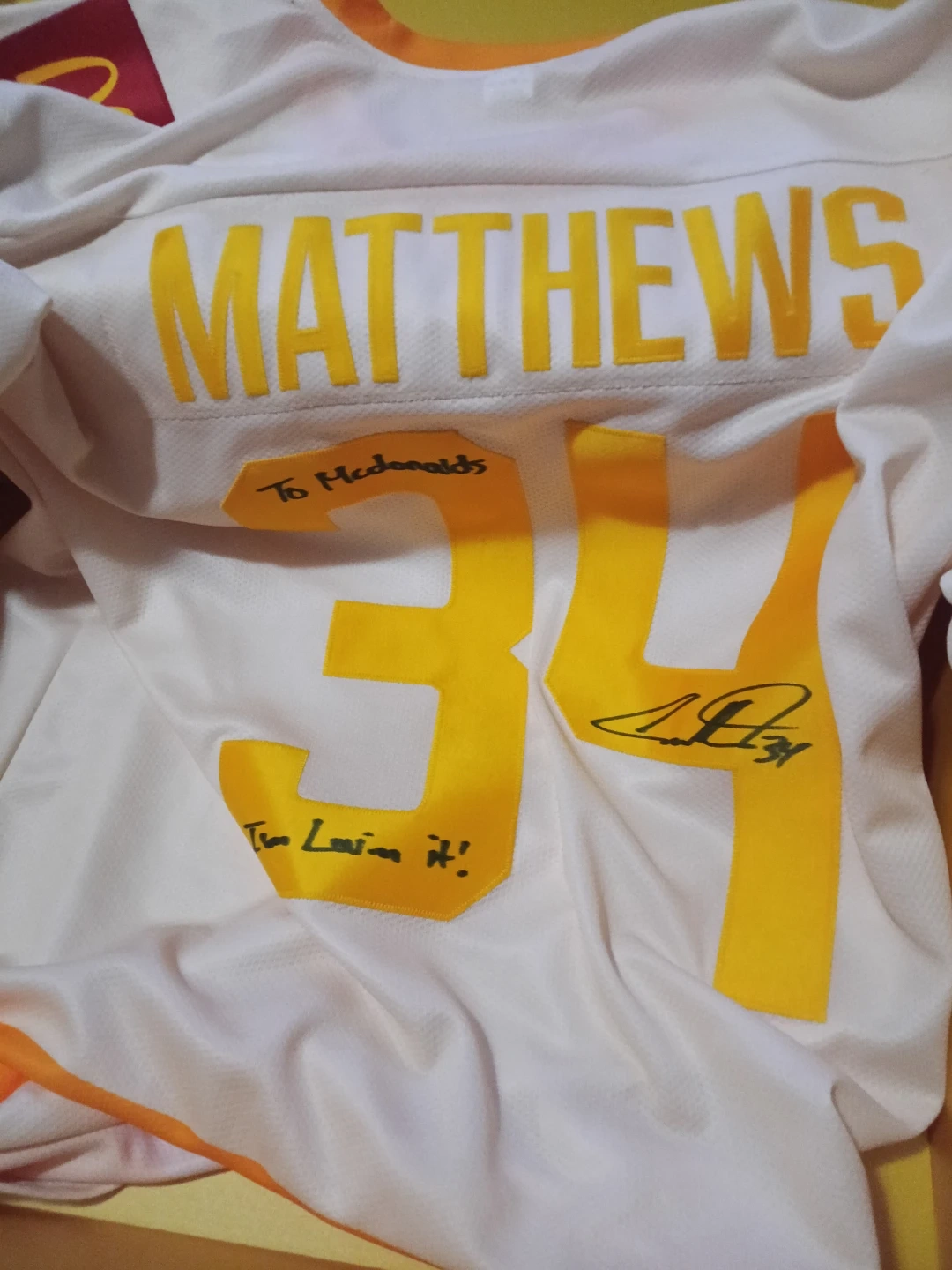 Authentic jersey signed by Matthews. It reads 'To McDonalds, I'm Lovin' It!' with a signature. Made in Canada from 100% polyester. Size L/G. Limited edition