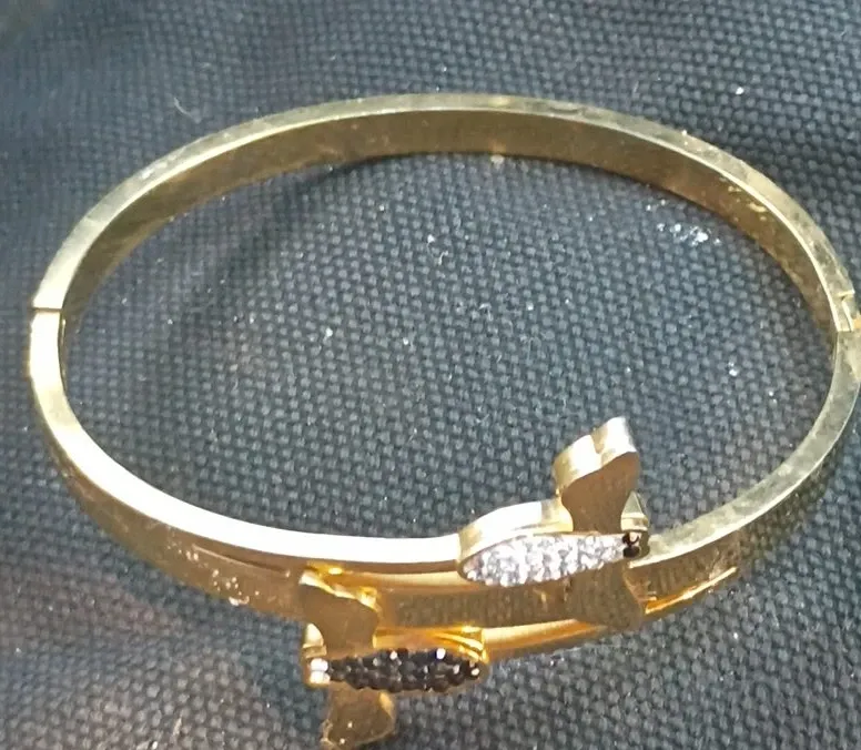 This gold-tone bangle bracelet features an animal charm with clear and black stones. It's a stylish accessory that adds a touch of sparkle to any outfit. The bracelet has a hinged closure for easy wear.