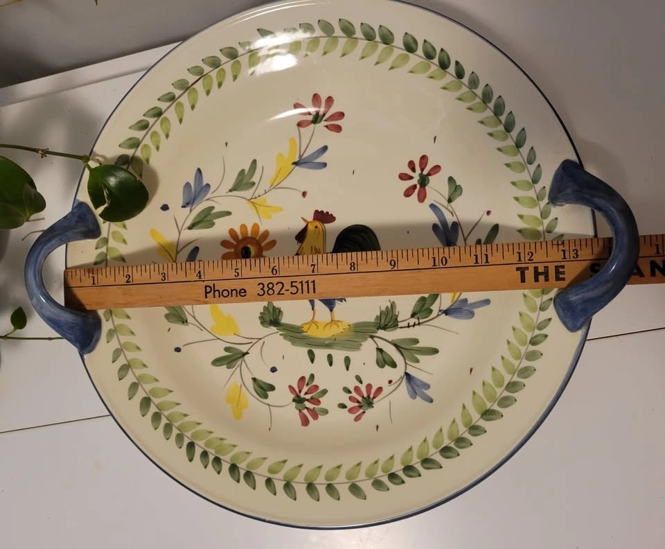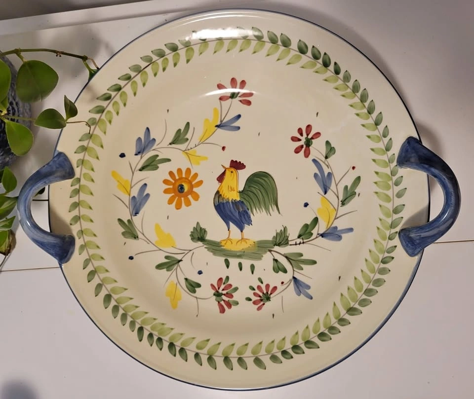 Ceramic serving dish with handles, 13.5" diameter.