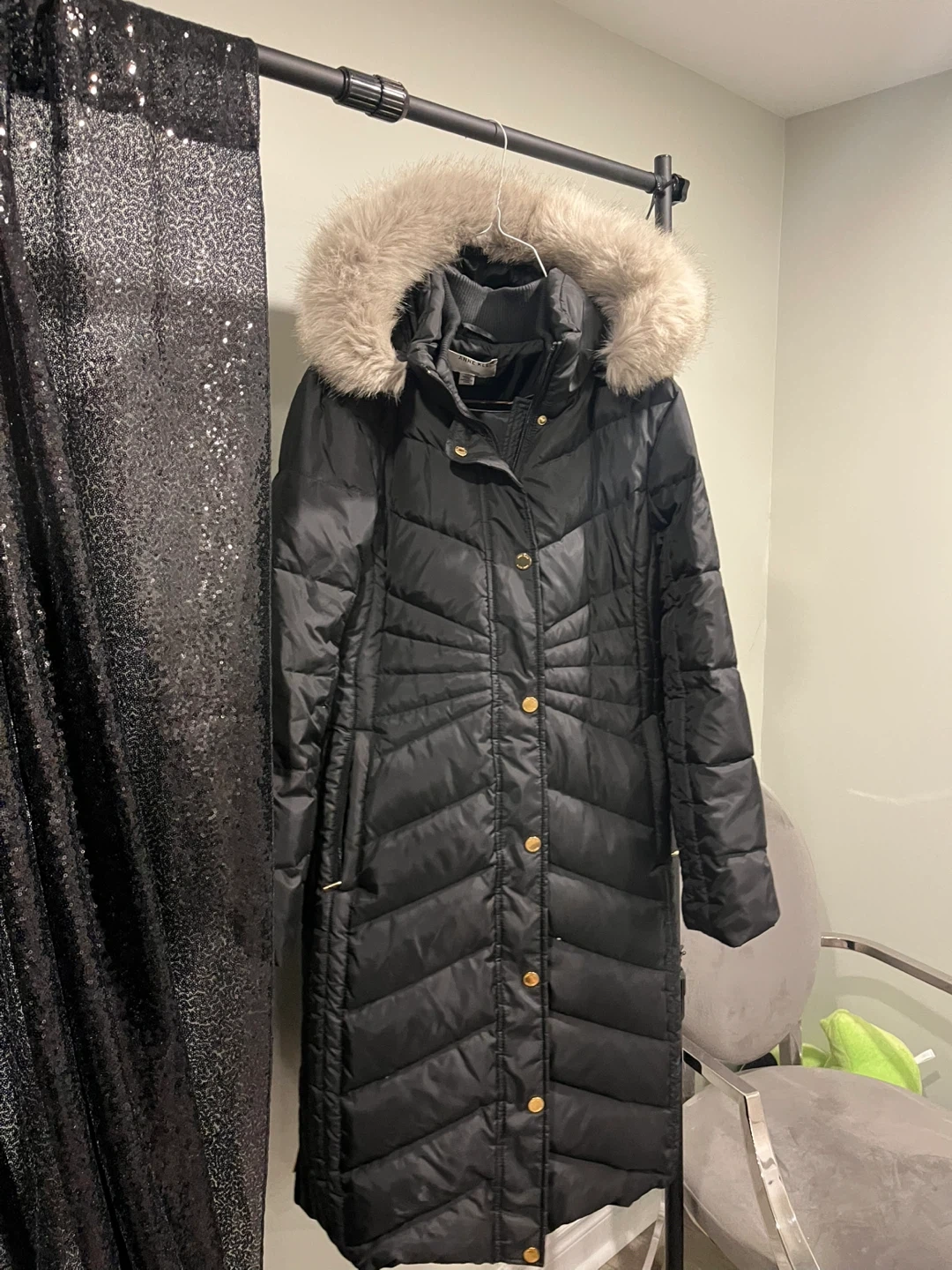 Selling a lovely Anne Klein black puffer coat in size large! It's in great condition and perfect for keeping warm during the colder months. The coat features a faux fur hood and gold button details. Also side zippers for easy driving Let me know if you have any questions!