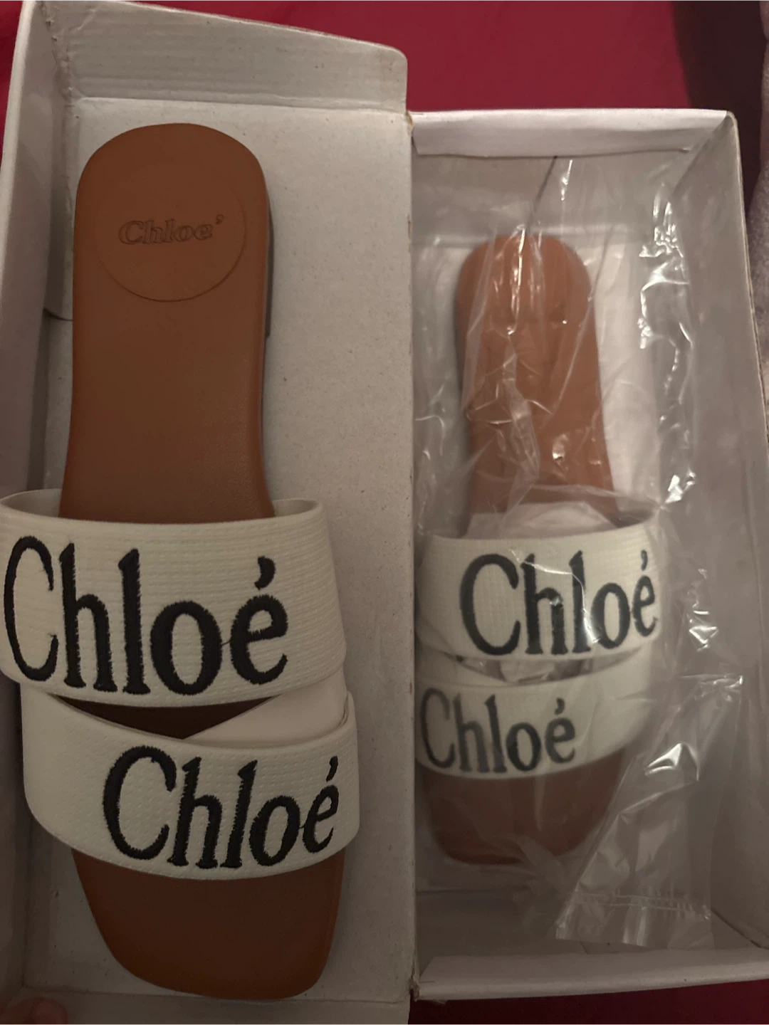 Brand new Chloe sandals in original box. White fabric straps with "Chloe" logo. Leather sole. Size 41.
