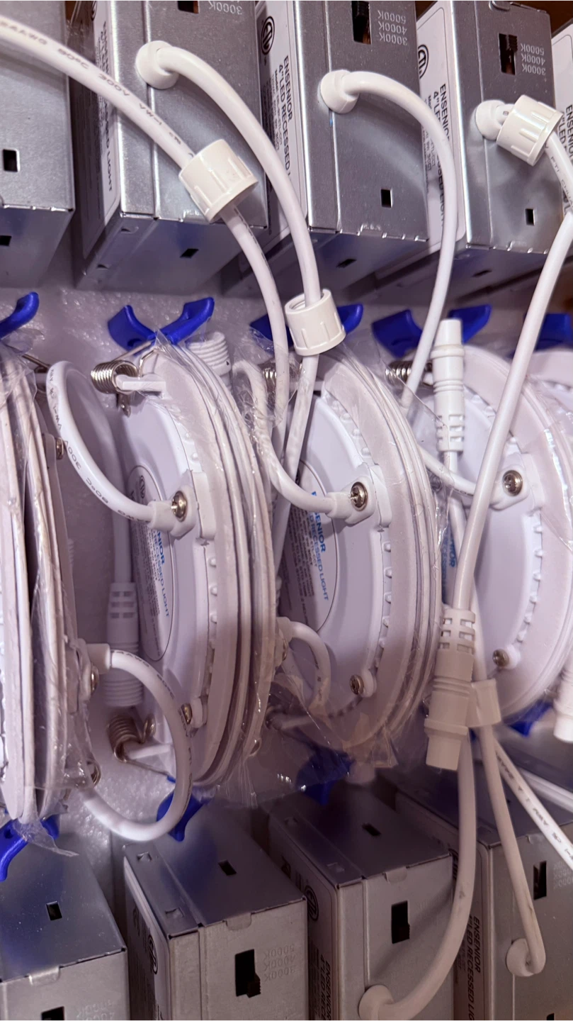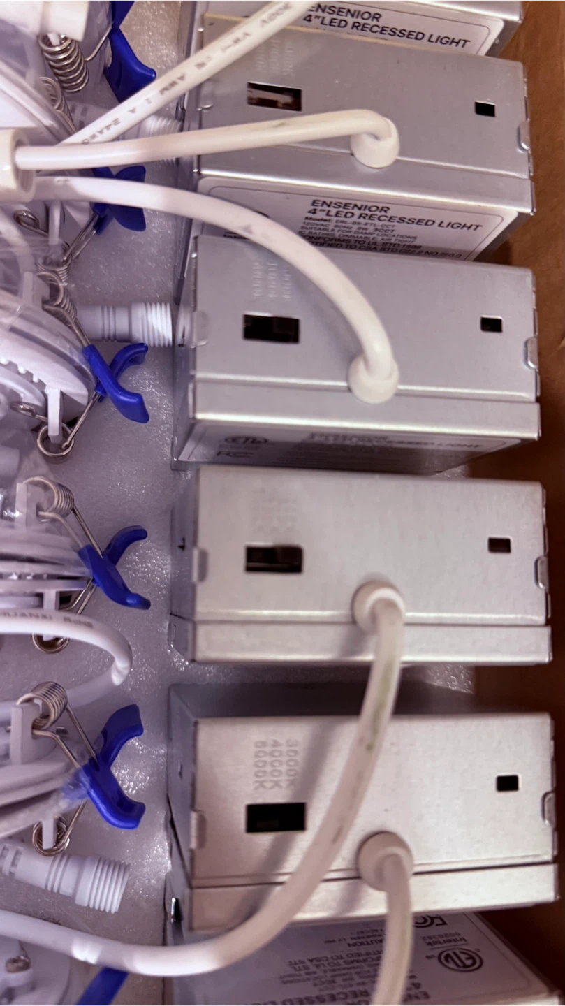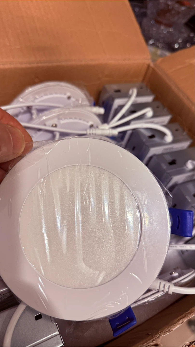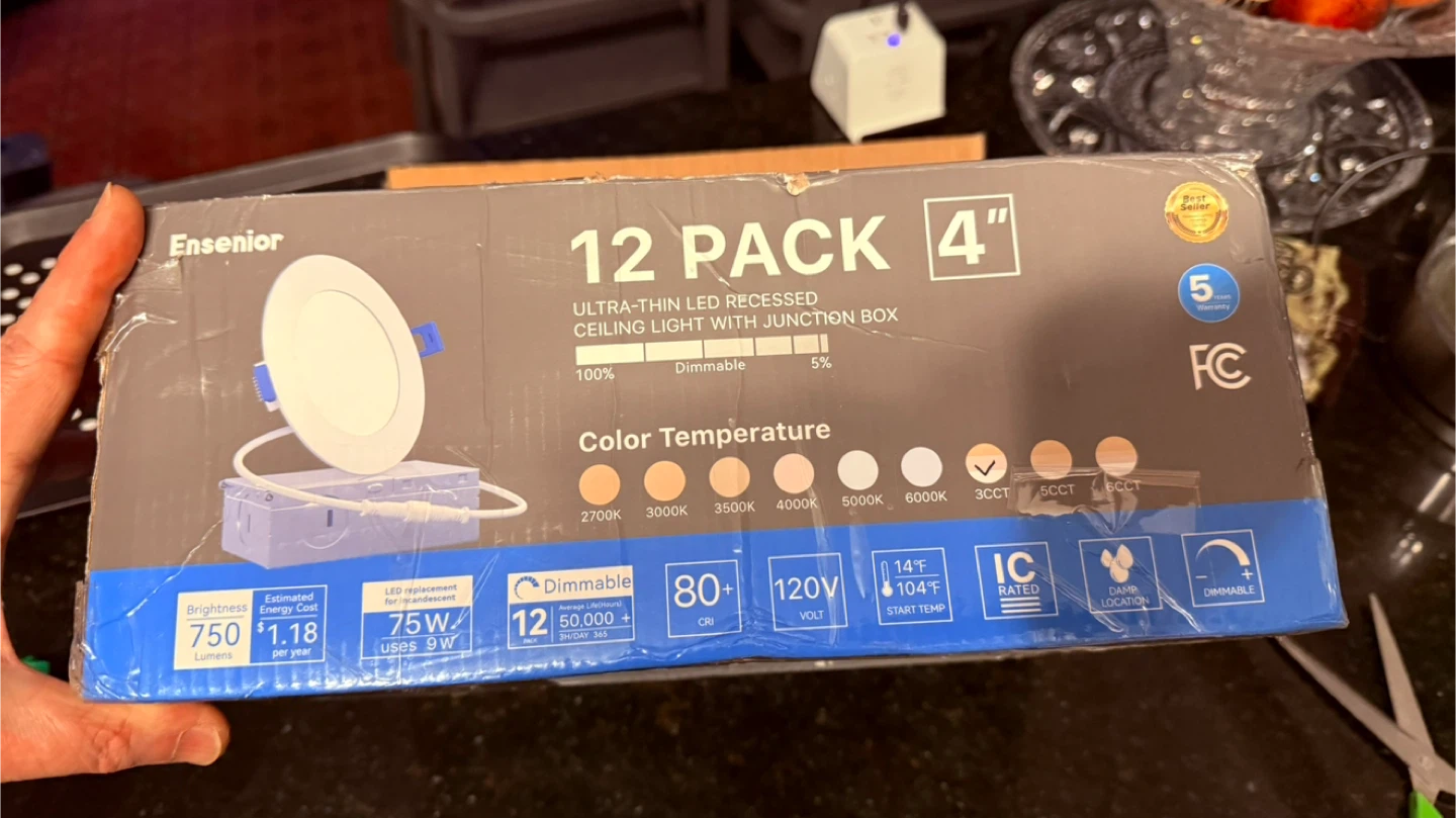 This is a 12-pack of Ensenior 4-inch ultra-thin LED recessed ceiling lights. Each light includes a junction box. They are dimmable and have a CRI of 80+.