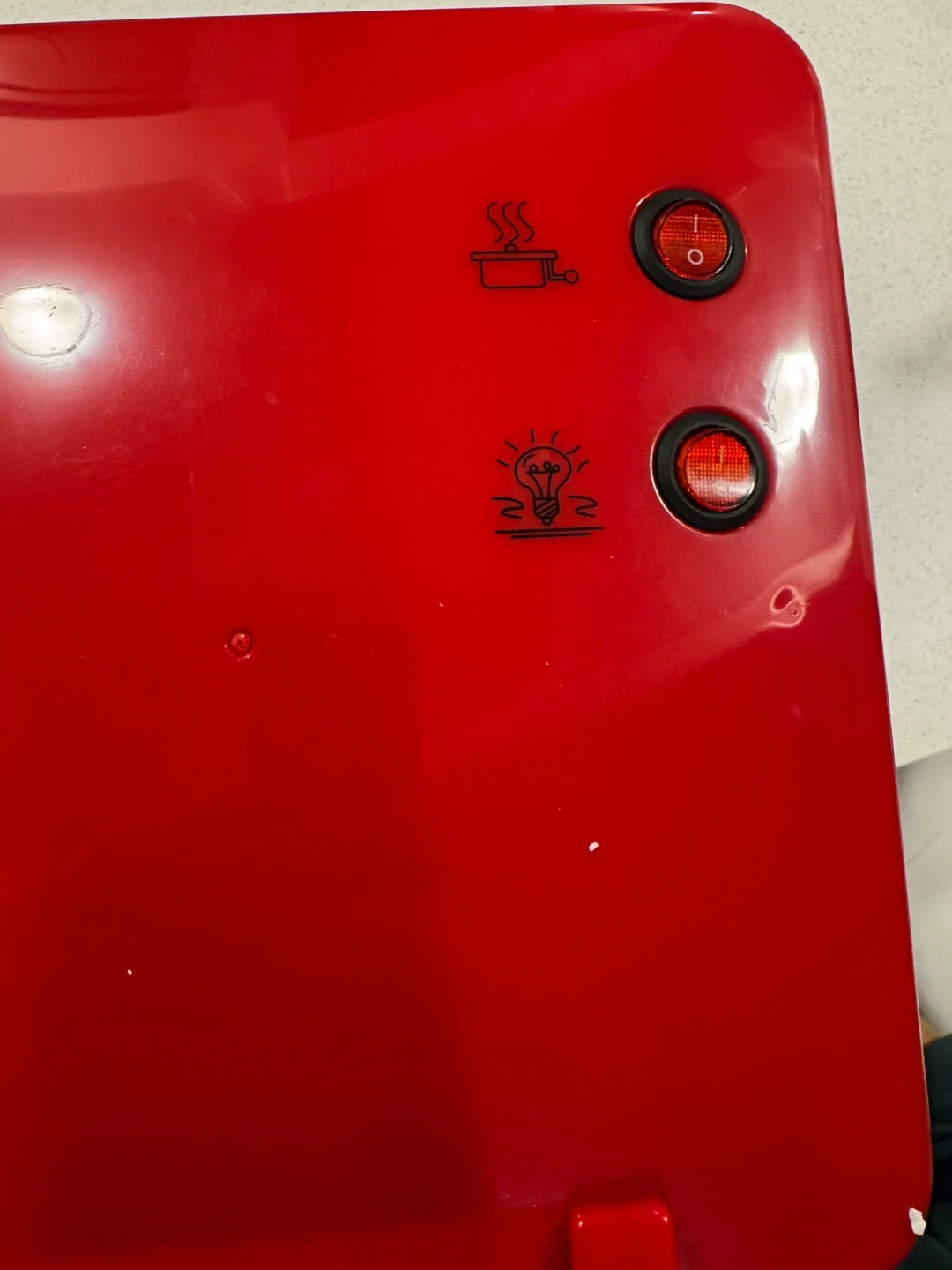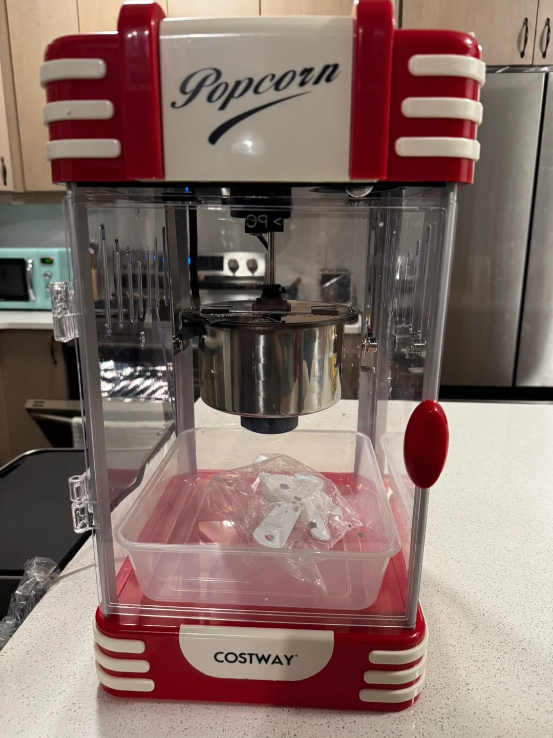 This is a red retro popcorn machine. It features a stainless steel popping pot. The machine has separate switches for the lamp and the heating element.