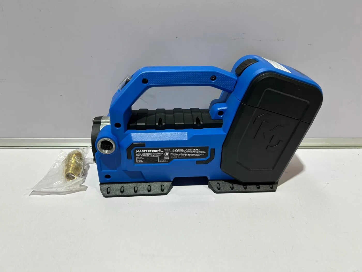 This is a Mastercraft 20V transfer pump. It's a battery-powered unit for convenient use. This pump is great for transferring fluids like gas or water safely and efficiently.