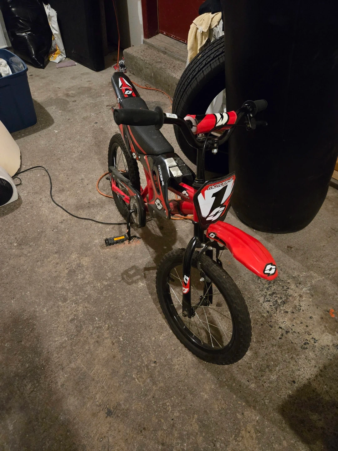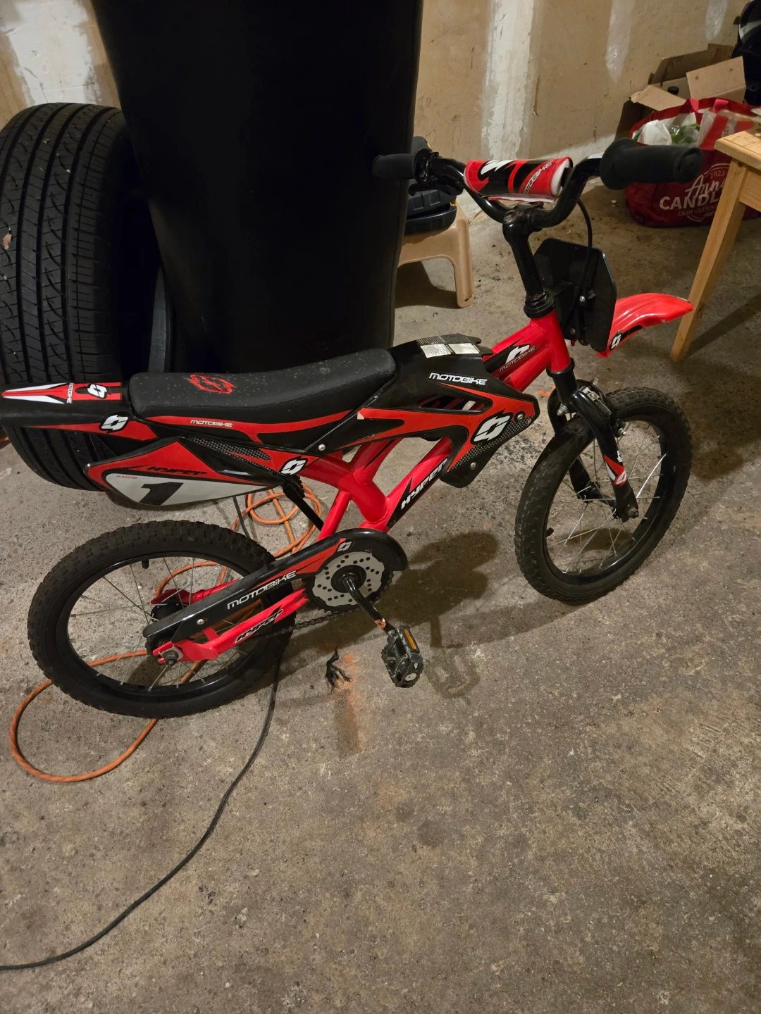 This is a red kids' bicycle designed to look like a motobike. It has a durable frame suitable for young riders. The handlebars and seat are adjustable for a comfortable fit. It measures 44 in length, 31 in tall.