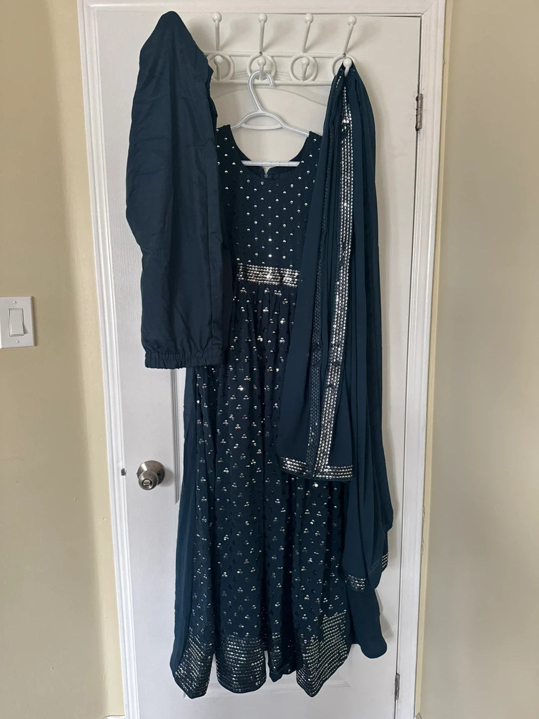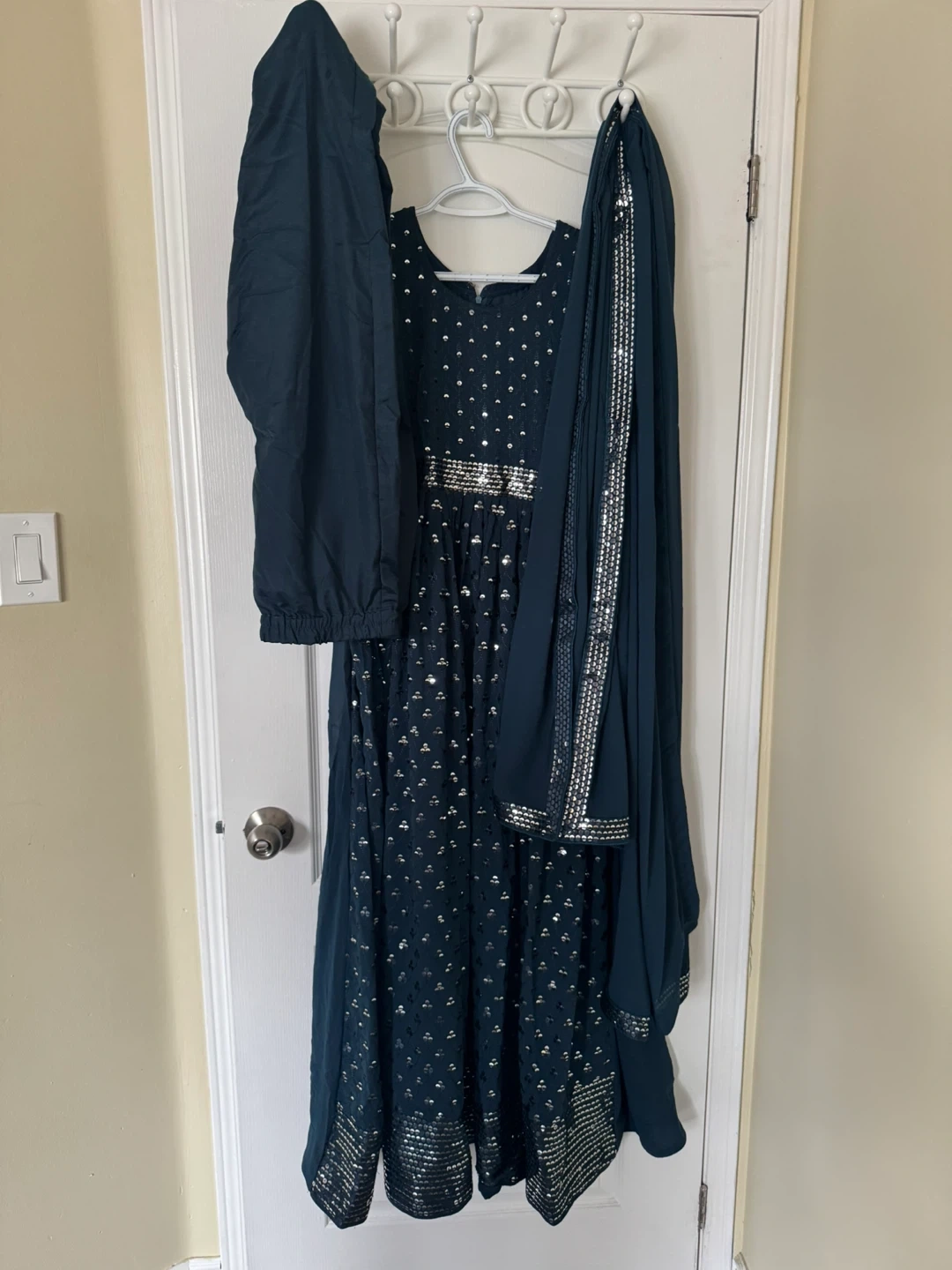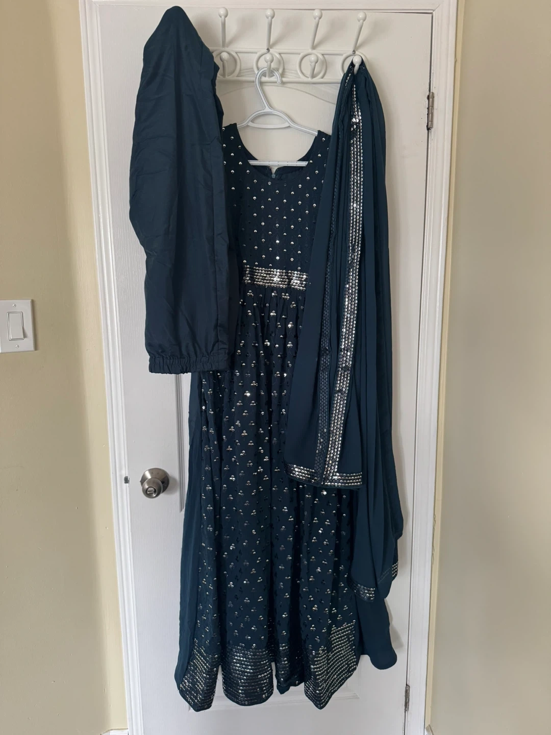 Selling a beautiful Anarkali dress, complete with matching pants and dupatta. The dress features intricate silver detailing. It's in great condition and ready for your next wedding party! It shines super beautifully and will be the star of your party or wedding!! Size is women small.