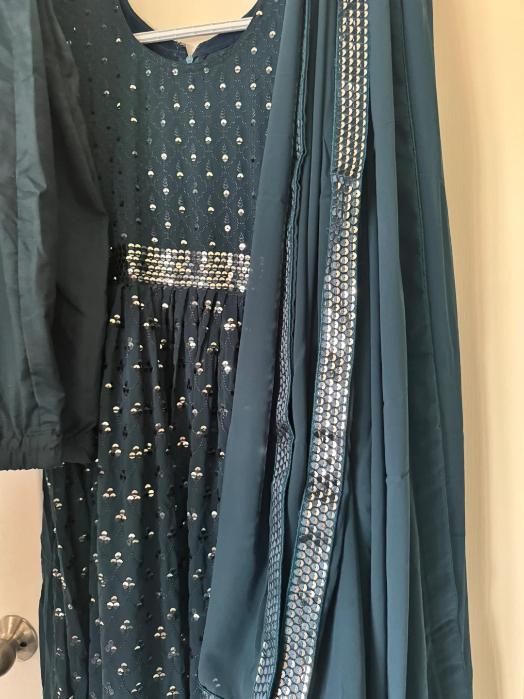 Selling a beautiful Anarkali dress, complete with matching pants and dupatta. The dress features intricate silver detailing. It's in great condition and ready for your next wedding party! It shines super beautifully and will be the star of your party or wedding!! Size is women small.