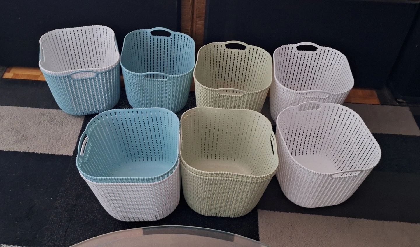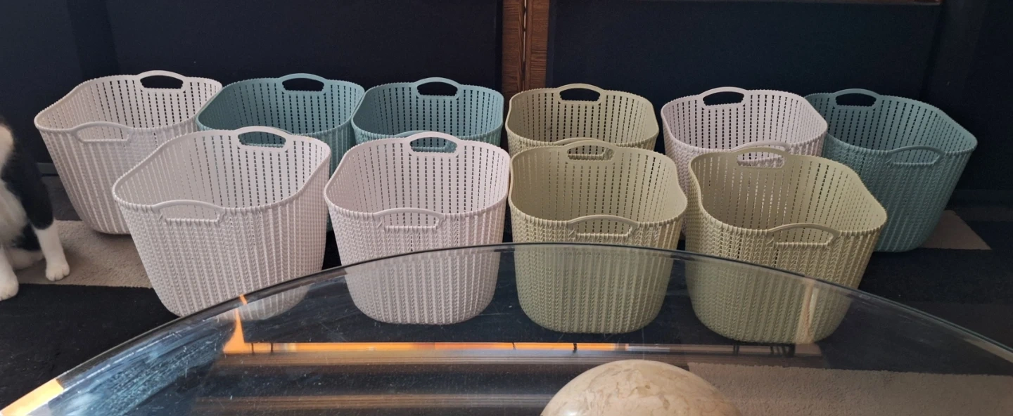 10 Plastic Baskets all for $15. Used for crafts towels and storage. They sell at Dollarama $5 each. This is a STEAL!