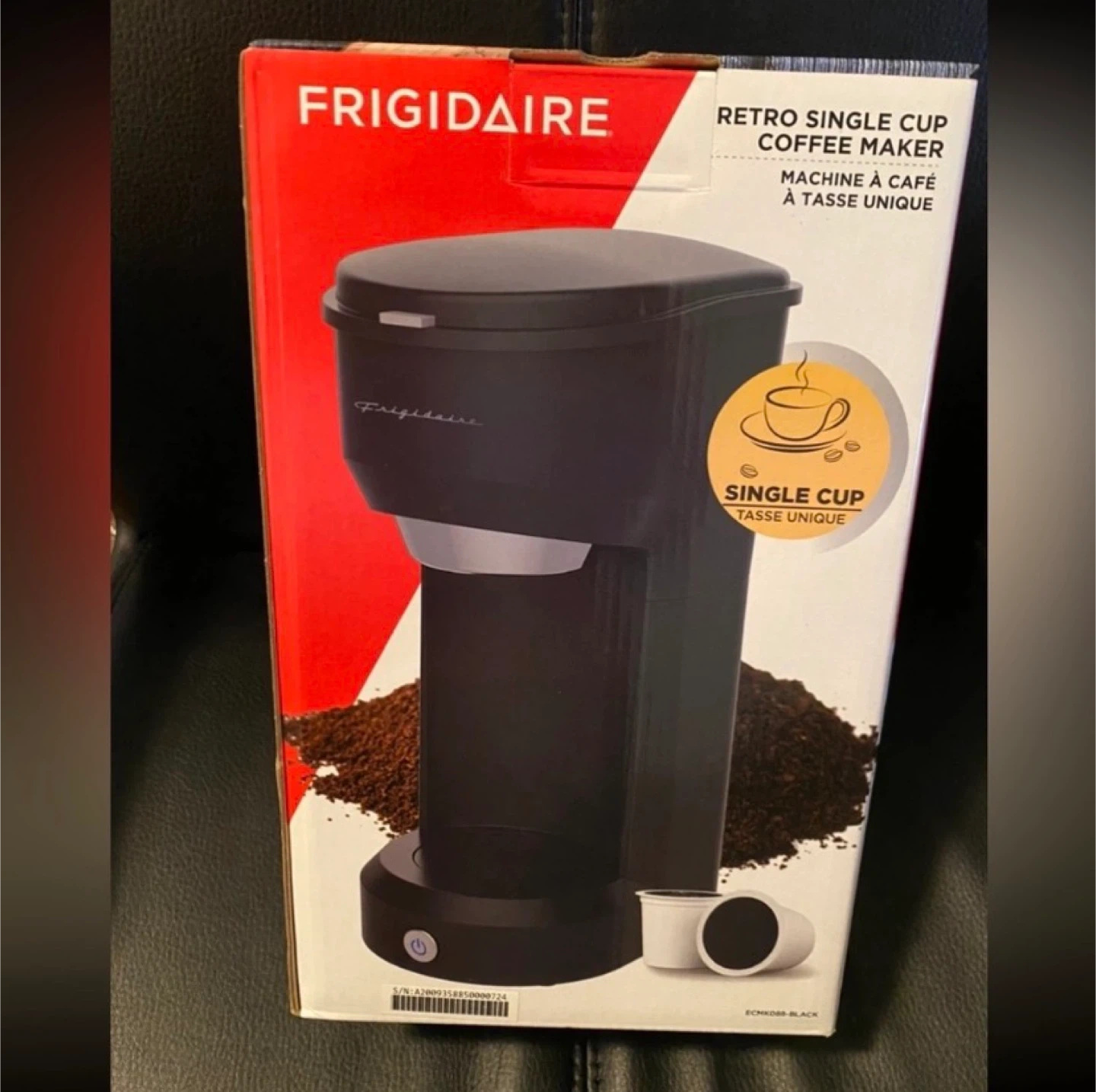 This is a black Frigidaire retro single cup coffee maker. It's designed for making coffee quickly. It's great for single servings and comes in its original box.