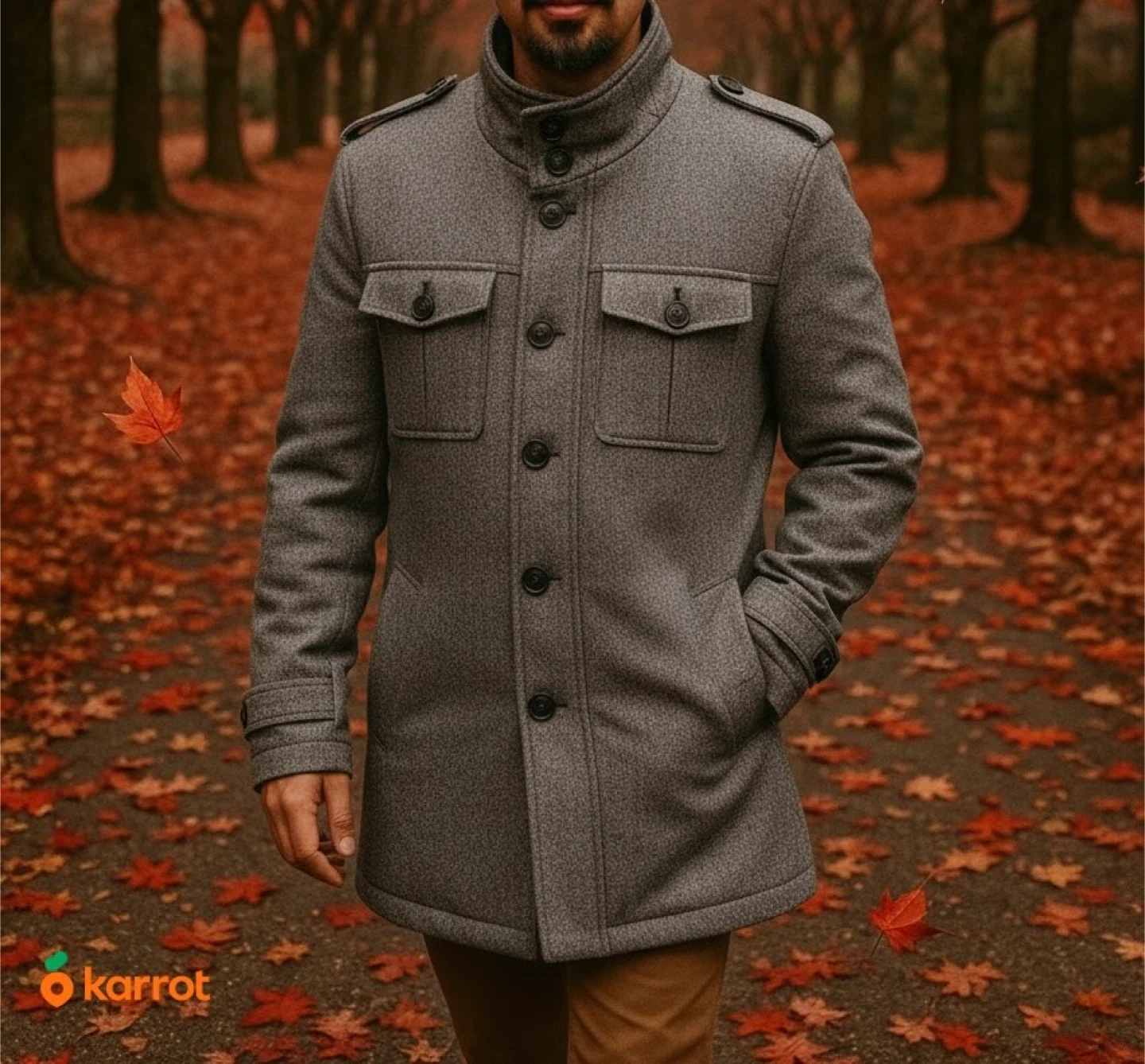 Grey jacket with black buttons and pockets. The jacket has a high collar. It has a unique design.