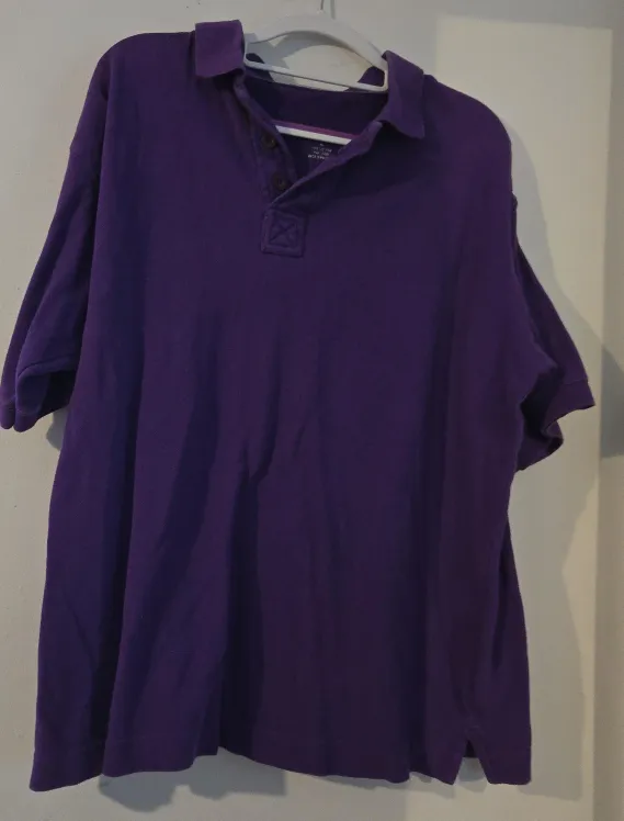 This is a men's short-sleeve polo shirt in a vibrant purple color. It features a classic collar and a button placket. The material is a comfortable cotton blend.