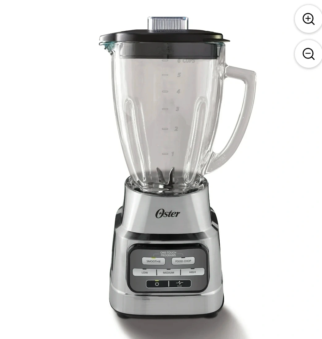 This Oster Pro 1200 blender features a 6-cup glass jar. It offers one-touch programs for smoothies and food chopping, with low, medium, high, and pulse speed settings. It's great for everyday kitchen tasks! Used 1 time