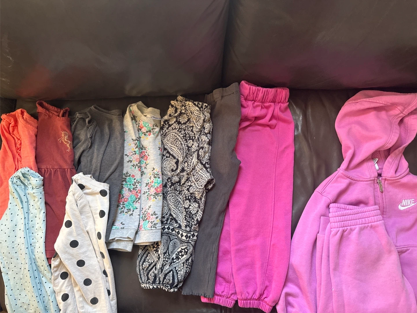 This bundle includes a variety of girls' tops and pants, featuring different patterns and colours. Includes a pink Nike tracksuit. Perfect for everyday wear!