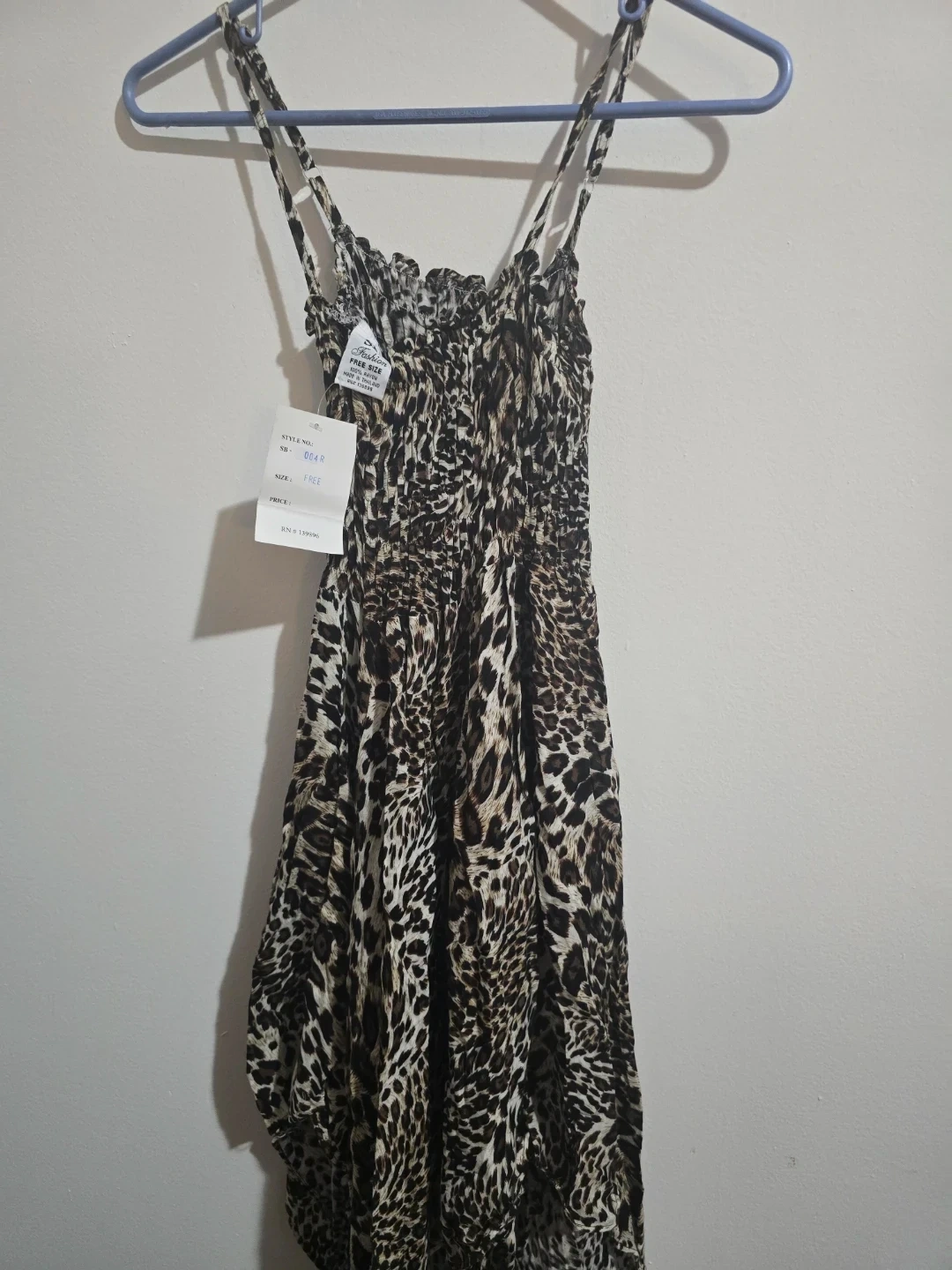 This women's sundress features a playful leopard print and a smocked bodice for a comfortable fit. It has adjustable spaghetti straps and a flowy skirt. The size is free, making it a versatile addition to your wardrobe! Free size very stretchy leopardo color