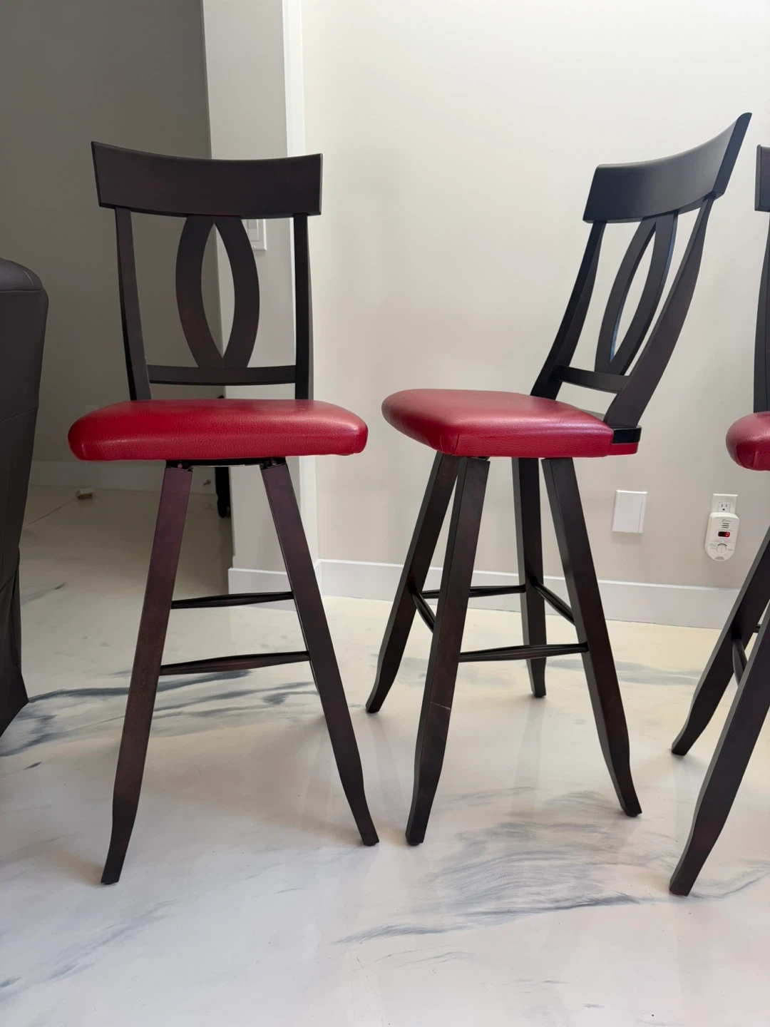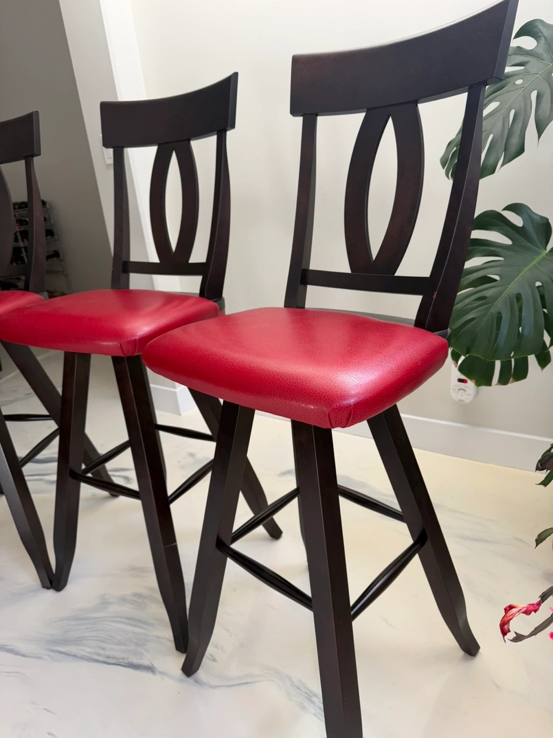 Three dark wood bar stools featuring comfortable red upholstered seats. They swivel smoothly for convenience. Dark wood finish with red faux leather seats. Perfect for your kitchen island or home bar!