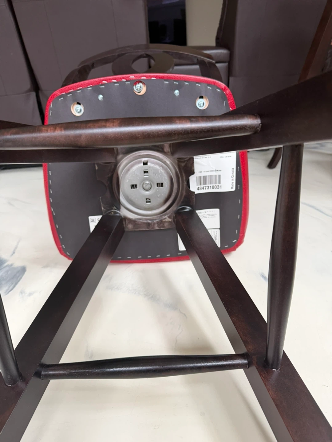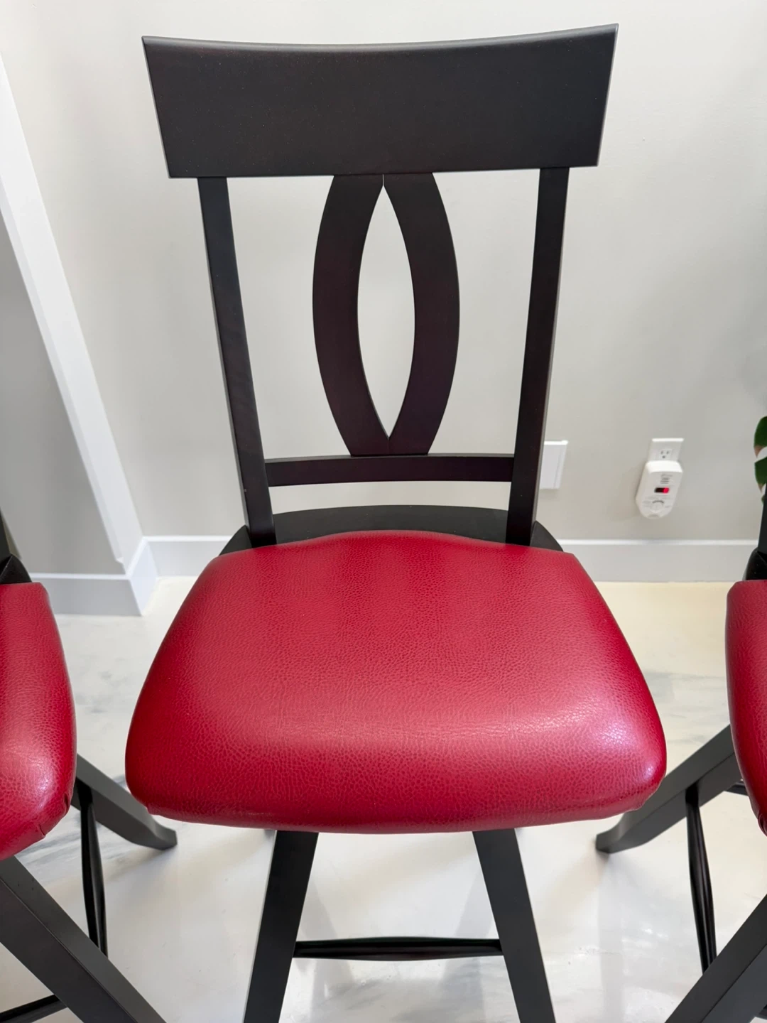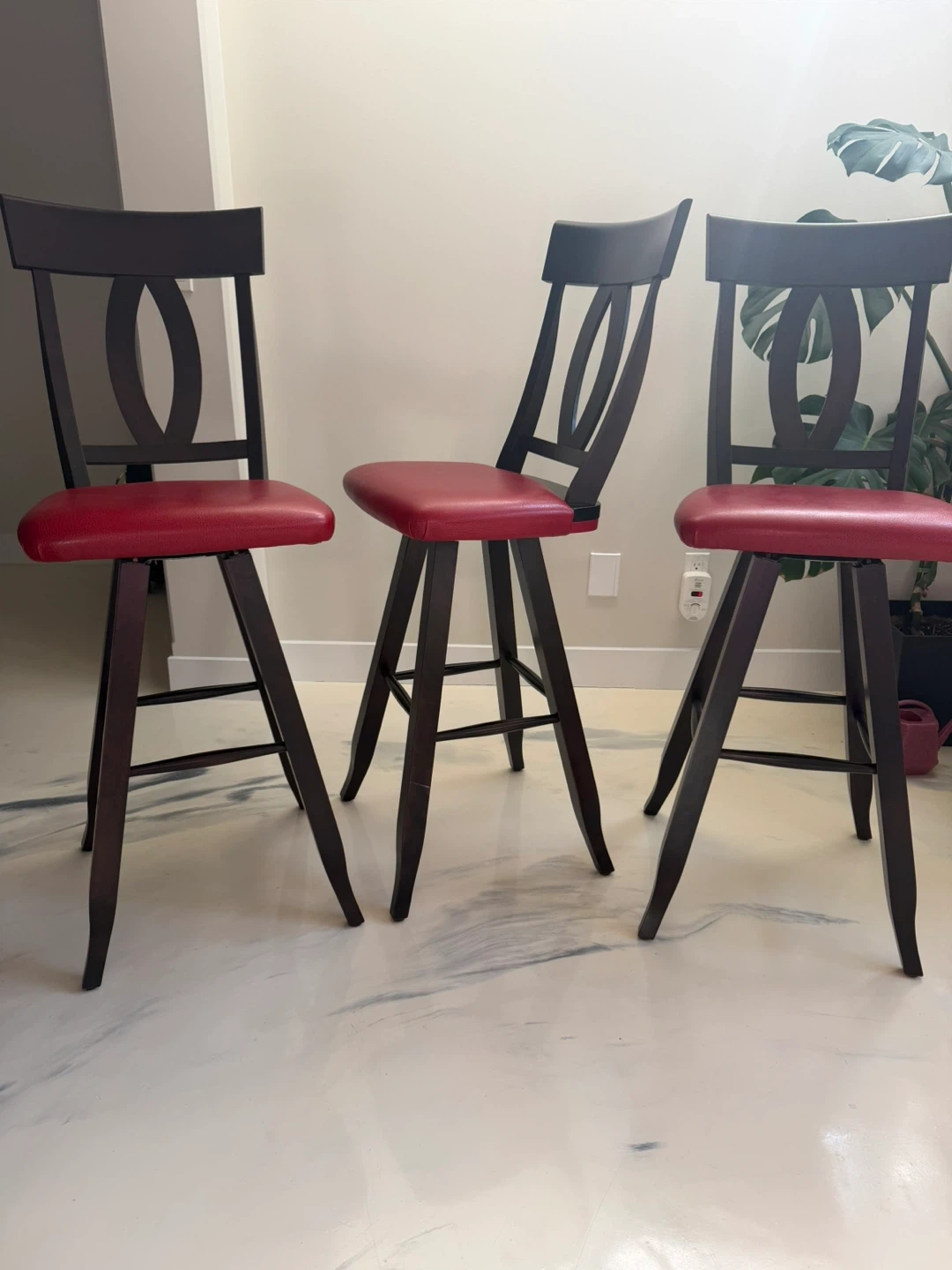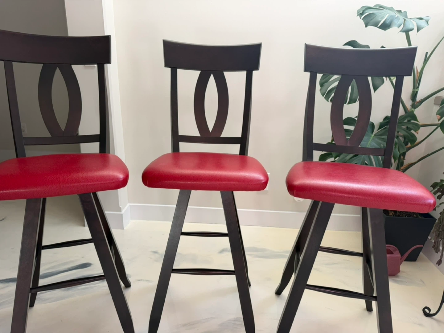 Three dark wood bar stools featuring comfortable red upholstered seats. They swivel smoothly for convenience. Dark wood finish with red faux leather seats. Perfect for your kitchen island or home bar!