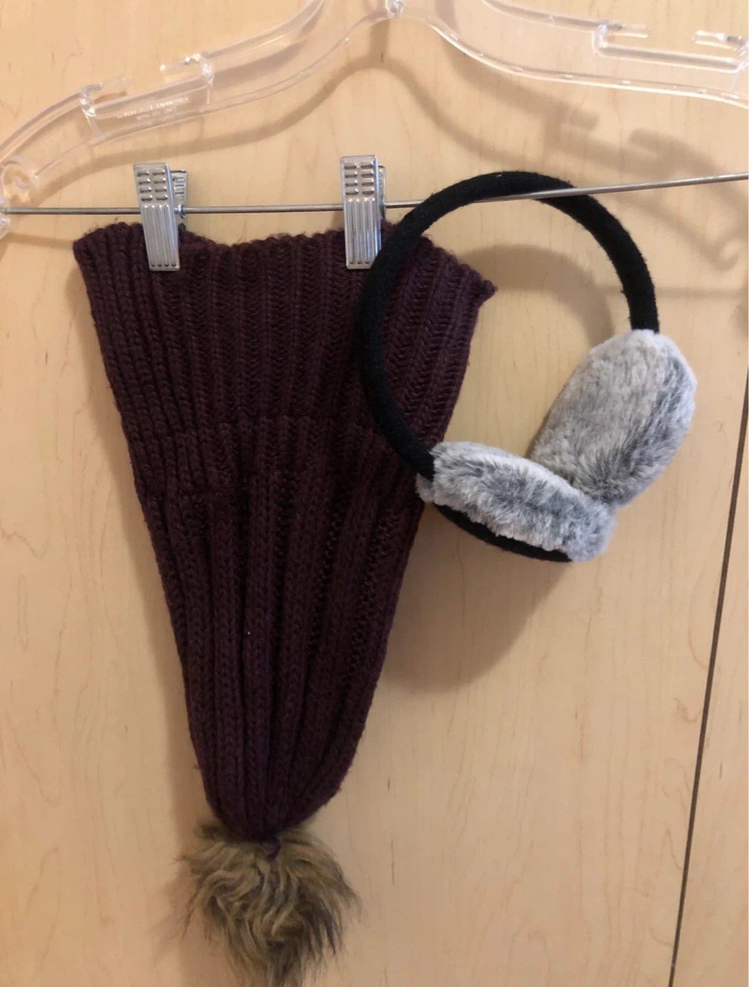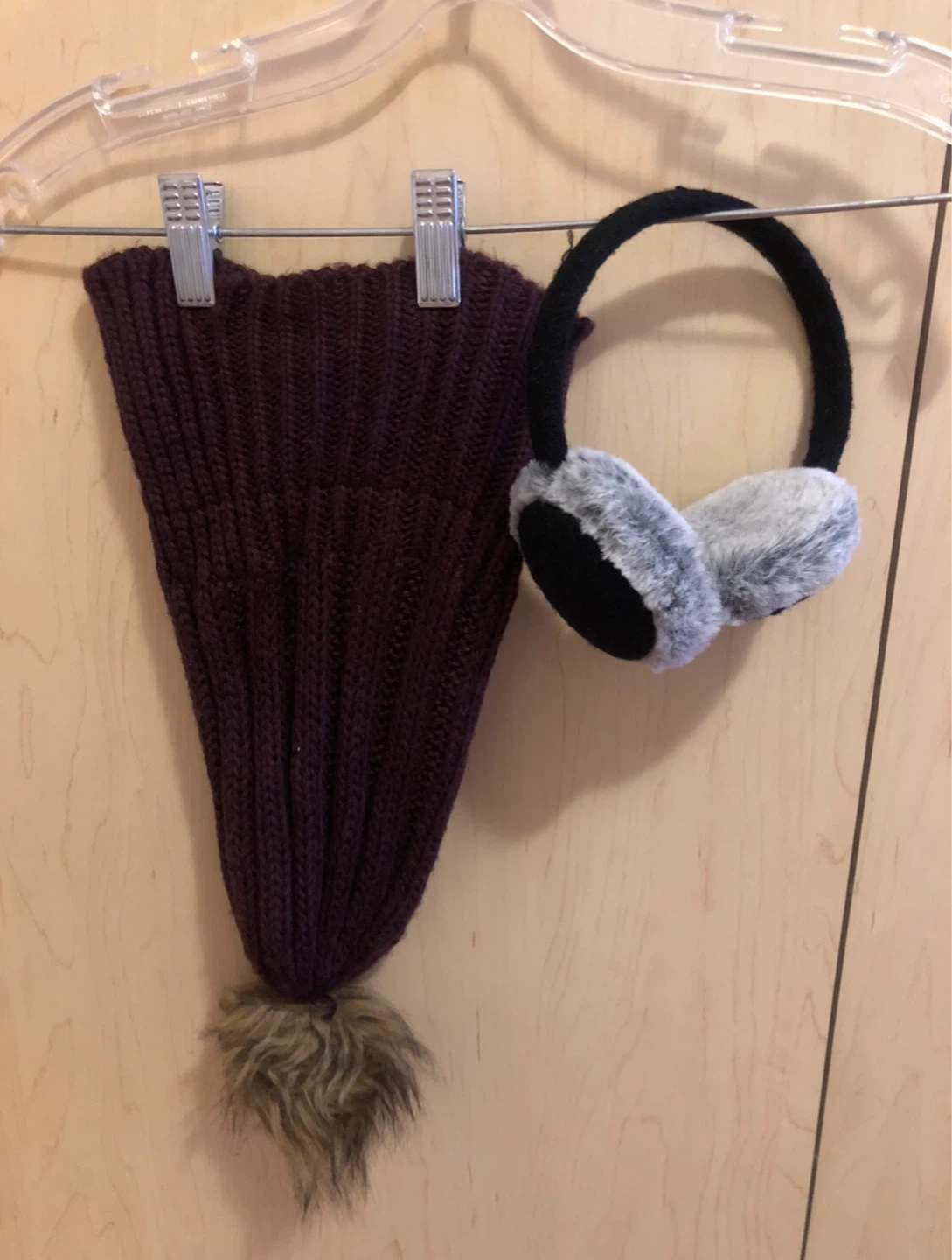 A plum-coloured ribbed knit hat with a faux fur pom-pom