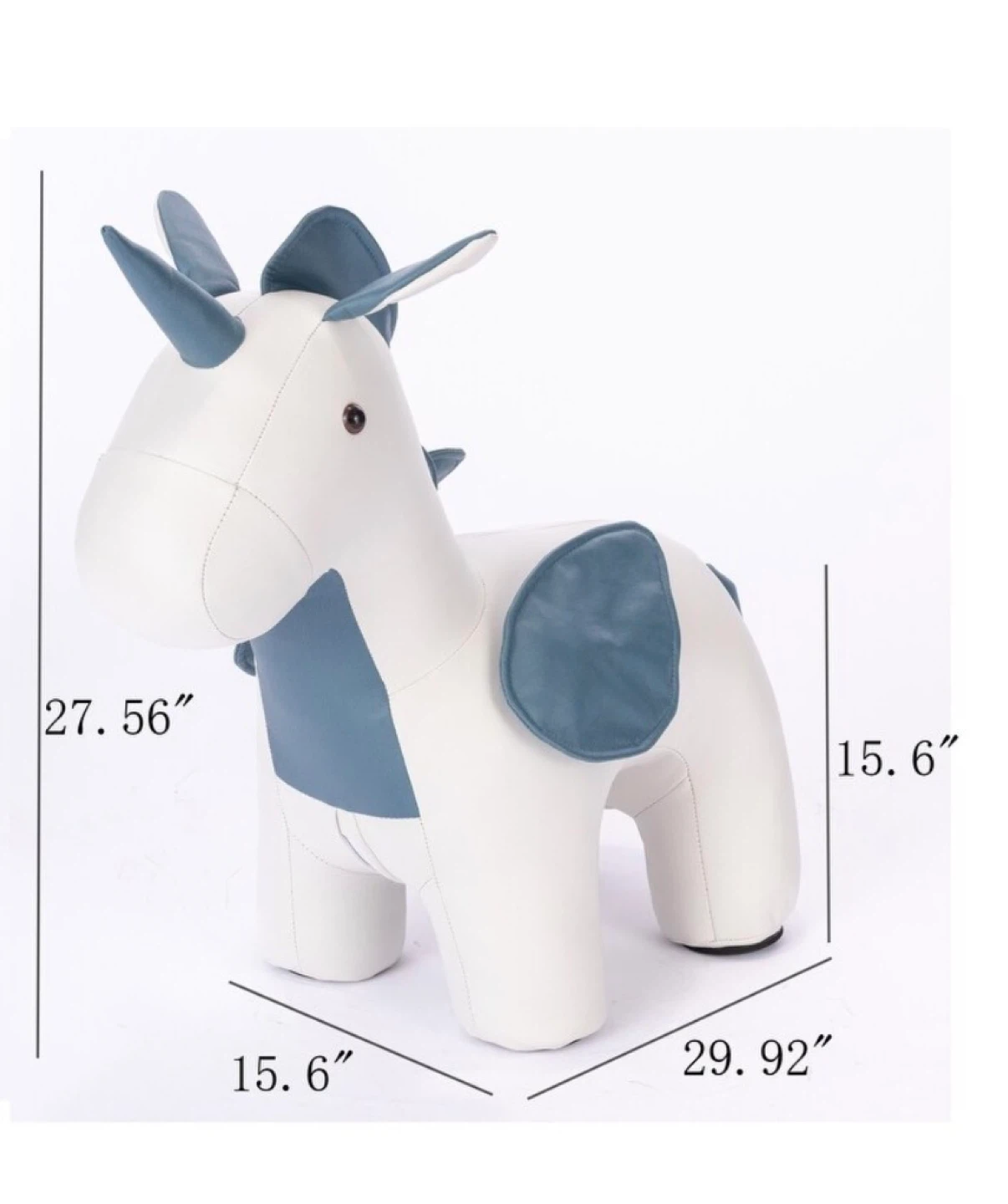 This adorable unicorn ottoman is brand new and still in its box! It features a white body with blue accents and is made of soft material, perfect for a child's room or playroom. The ottoman measures approximately 27.56" in height, 29.92" in length, and 15.6" in width. It's a cute and functional piece of decor!