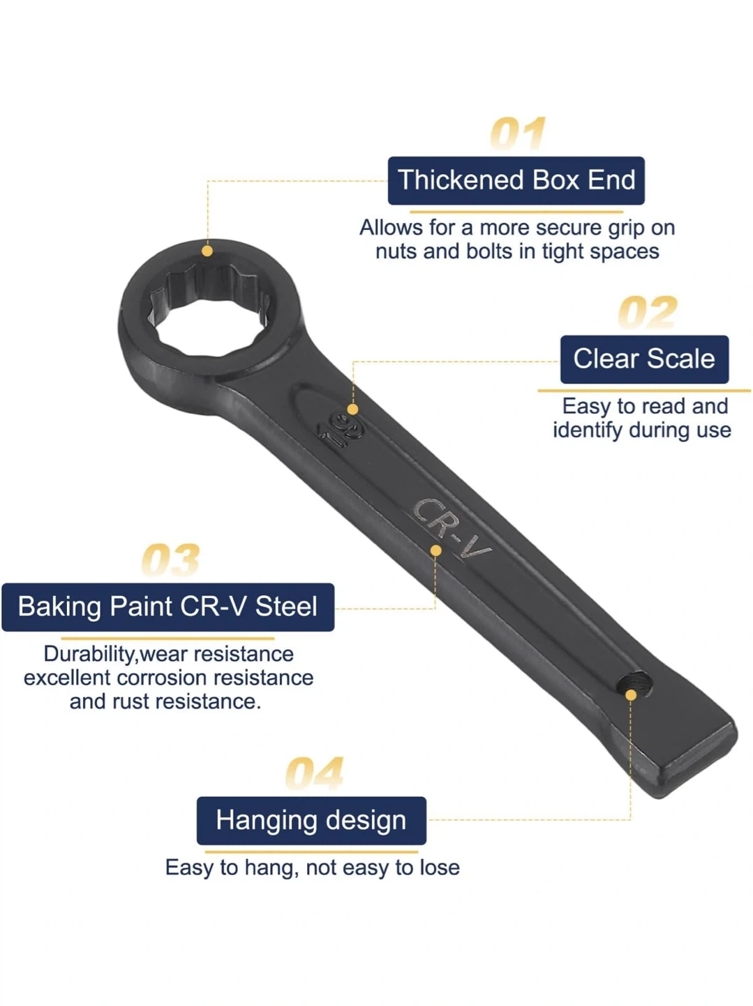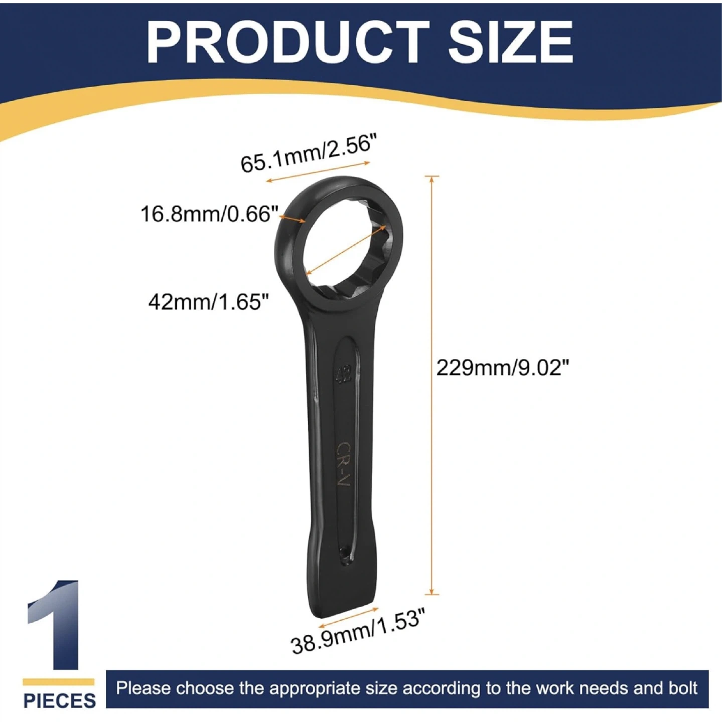 This is a single offset box end wrench made from CR-V steel. It has a durable baking paint finish for corrosion and rust resistance. The wrench measures 229mm in length. It's useful for working on nuts and bolts in tight spaces.