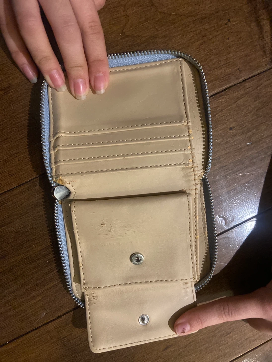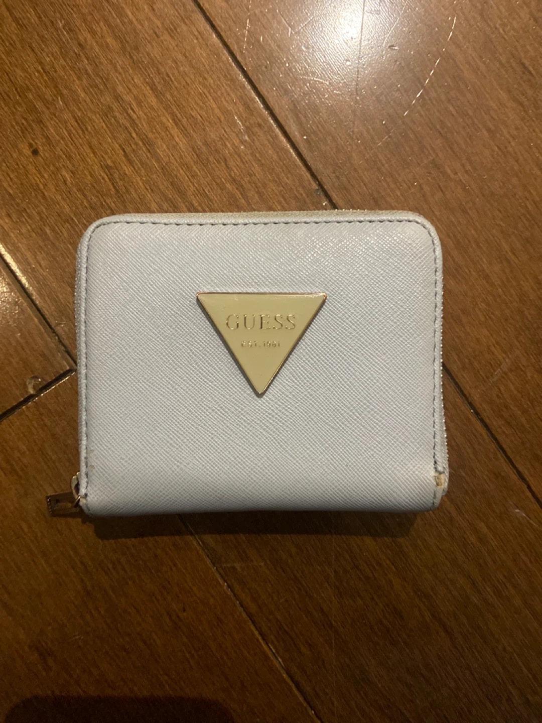 A light blue Guess wallet with a zip-around closure. It's got multiple card slots and a coin pocket inside. Saffiano leather look.